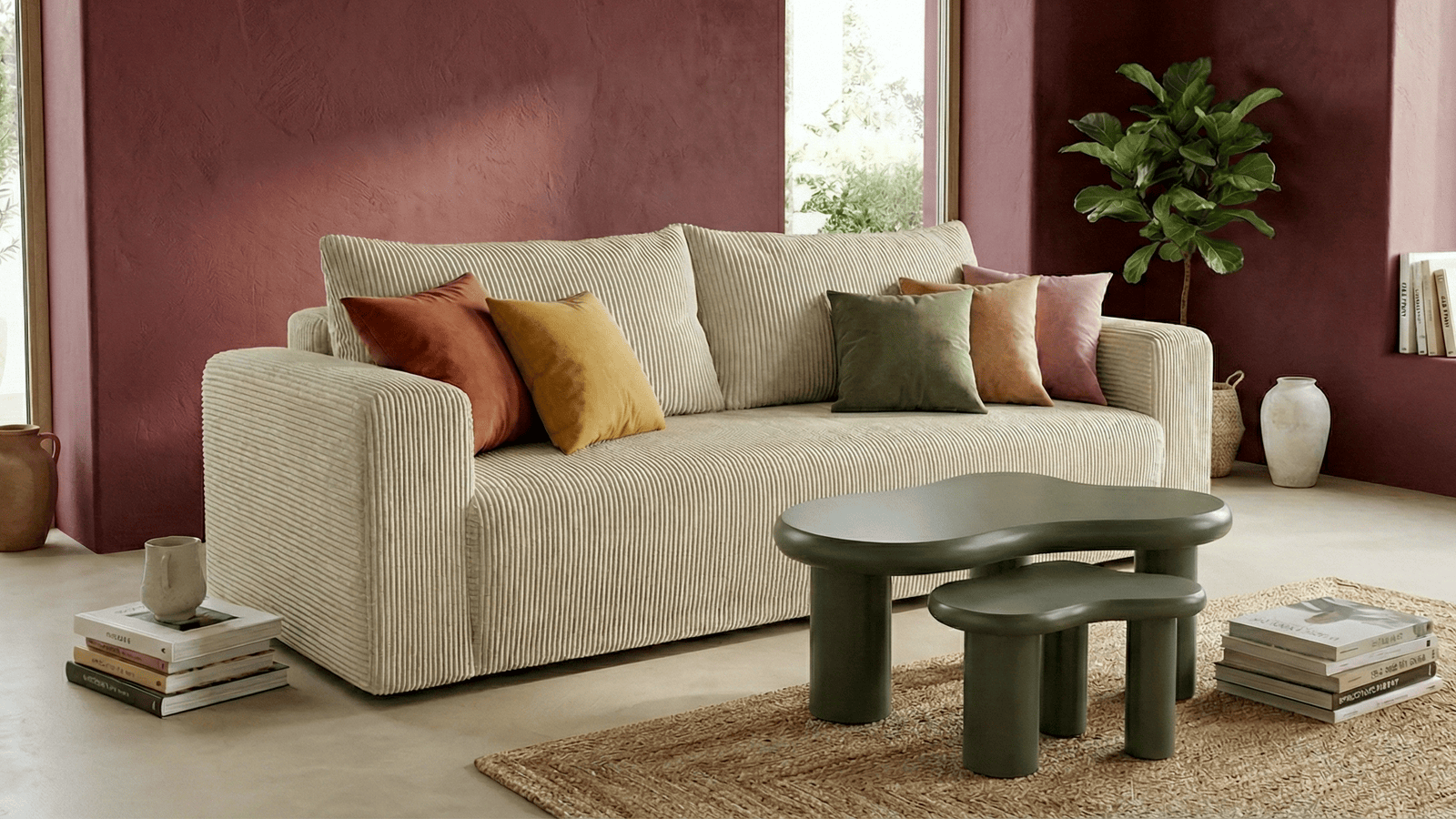 Le canapé convertible Fjord se distingue par son design contemporain et son revêtement en velours côtelé à la texture chaleureuse et élégante. Sa teinte beige, lumineuse et intemporelle, apporte une sensation de douceur et de sérénité à votre intérieur, tout en s’intégrant facilement dans tous les styles de décoration, du minimaliste au plus chaleureux.