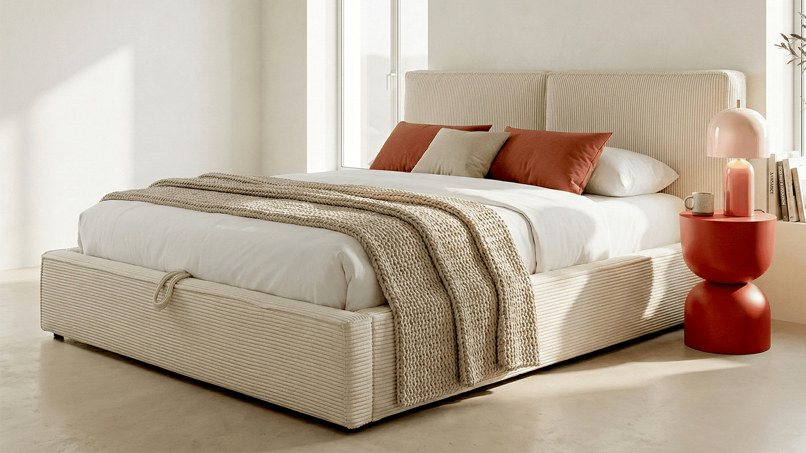 Le lit coffre Arno, est un cocon de douceur et de praticité. Confectionné avec une structure robuste en MDF, ce lit est revêtu d'un velours côtelé beige, doux et résistant.