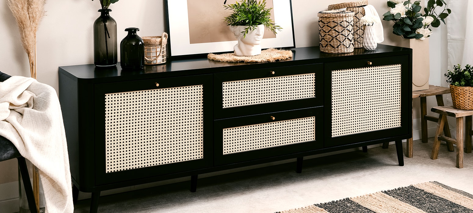 En stock• Buffet rotin et effet bois noir Padang • Cannage en rotin synthétique plus résistant pour une meilleure tenue dans le temps. • Matière : panneaux de particules, mélaminé • Couleur : noir • Matière du piétement : effet bois • 3 portes, 2 tablettes et 3 tiroirs • Dimensions totales : 175x40x84cm • Garantie 2 ans