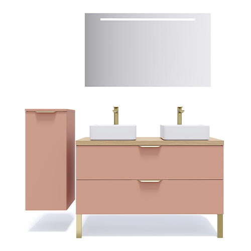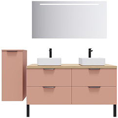 En stock• Ensemble Meuble, 2 vasques à poser, miroir et colonne• Couleur du meuble : terracotta• Finition du meuble : mat• Poignées doré brossé• Plan de toilette stratifié couleur• Vasque carrée en céramique - Blanc brillant• Nombre de tiroirs : 2 - Les tiroirs sont équipés du système softclose• Demi-colonne 1 porte - ouverture à gauche• Dimensions du meuble de...