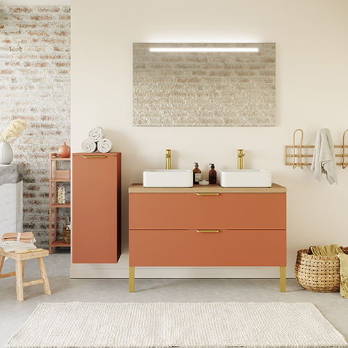 En stock• Ensemble meuble de salle de bain et 2 vasques à poser • Corps de meuble en mélaminé, épaisseur 16 mm, traverses aluminium, assemblage en usine par tourillons collés• Couleur du meuble : terracotta• Finition du meuble : Mat• Plan de toilette stratifié couleur chêne clair• Vasque en céramique - blanc brillant • Nombre de tiroirs : 2 - Les tiroirs sont...