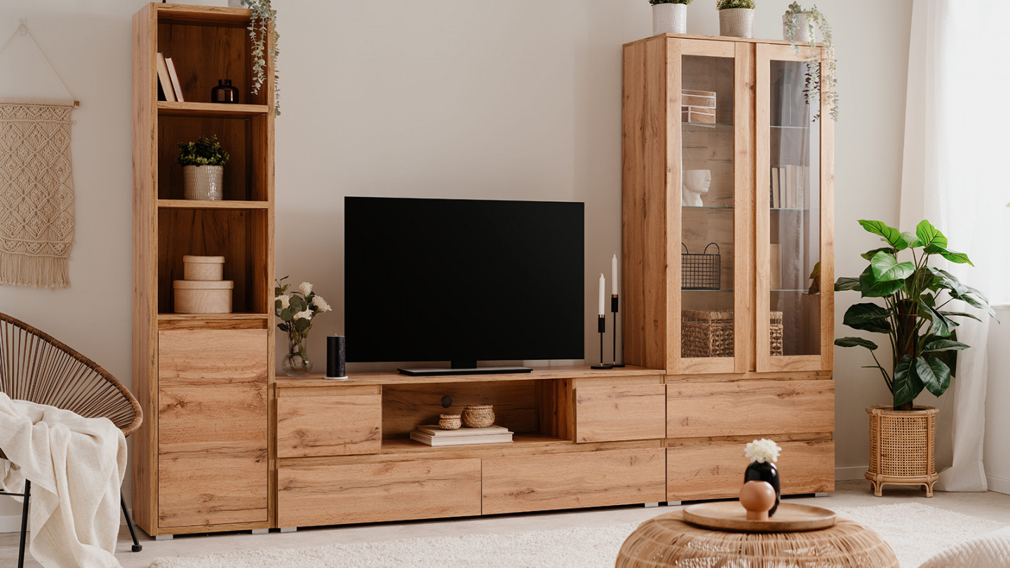 Le pin est une option plus abordable et légère, très utilisée pour les meubles TV dans les styles rustique.