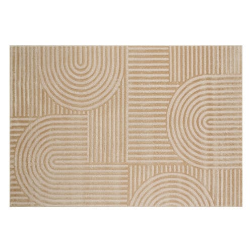 En stock• Tapis beige en relief motif arc • Tapis poils en relief d'intérieur • Texture moelleuse • Matière : polypropylène • Hauteur du fil 12 mm - Densité 2200gr/m² • Dimensions : 160x230