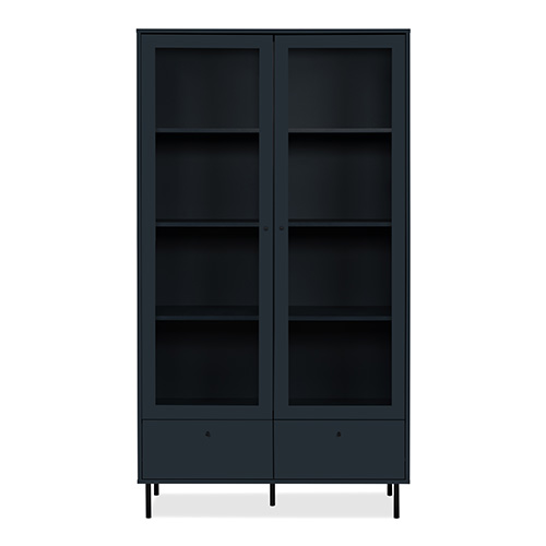 Rupture de stock• Vaisselier / Vitrine bleu nuit• Matière : Panneaux de particules, mélamine, métal• Couleur : bleu nuit• Piétement en métal noir• 2 portes vitrées - 2 tiroirs• Dimensions totales : 100 x 40 x 183 cm