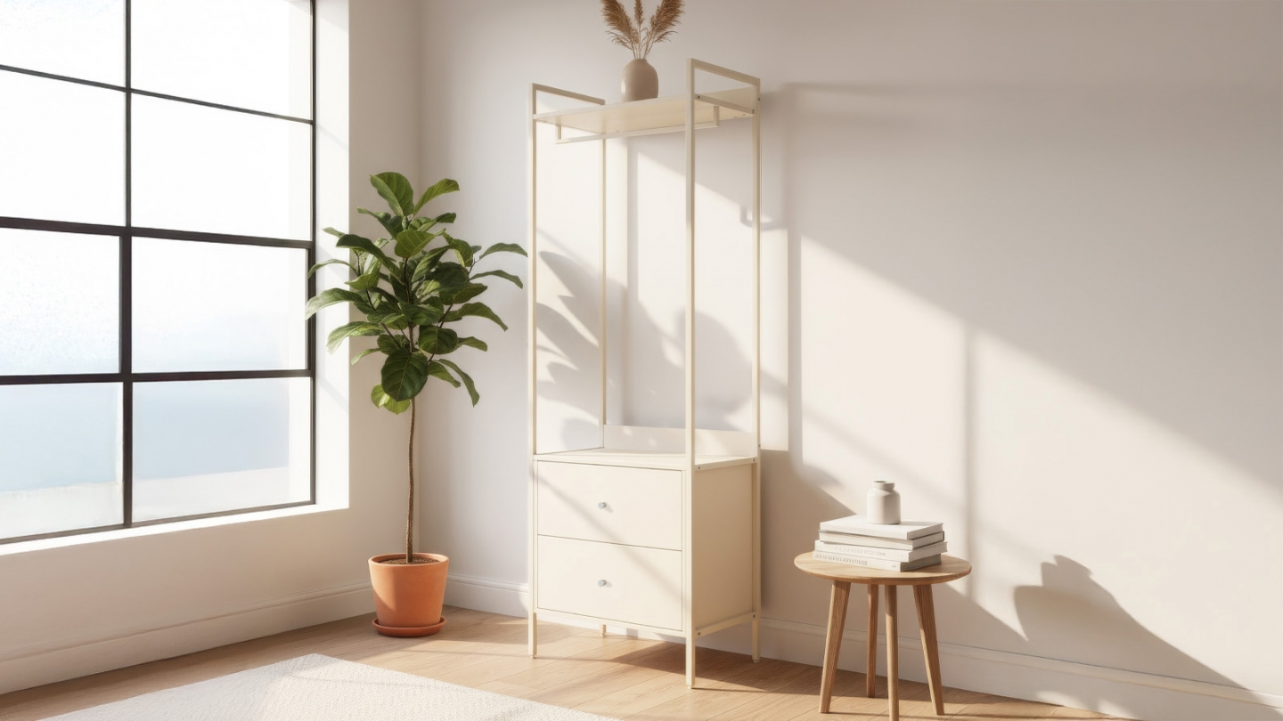Vestiaire / Penderie - Veska• Matière : Métal, mélamine• Couleur : Beige• Rangements : 4 tablettes, 1 tringle• Dimensions totales : 84 x 40 x 190 cm