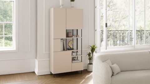Avec son coloris beige et son piètement noir, le modèle Lise crée une atmosphère douce et équilibrée, tout en restant résolument tendance. Son design astucieux, mêlant espaces ouverts et rangements fermés, en fait une solution idéale pour garder un intérieur ordonné sans compromettre le style.