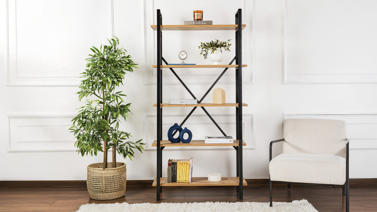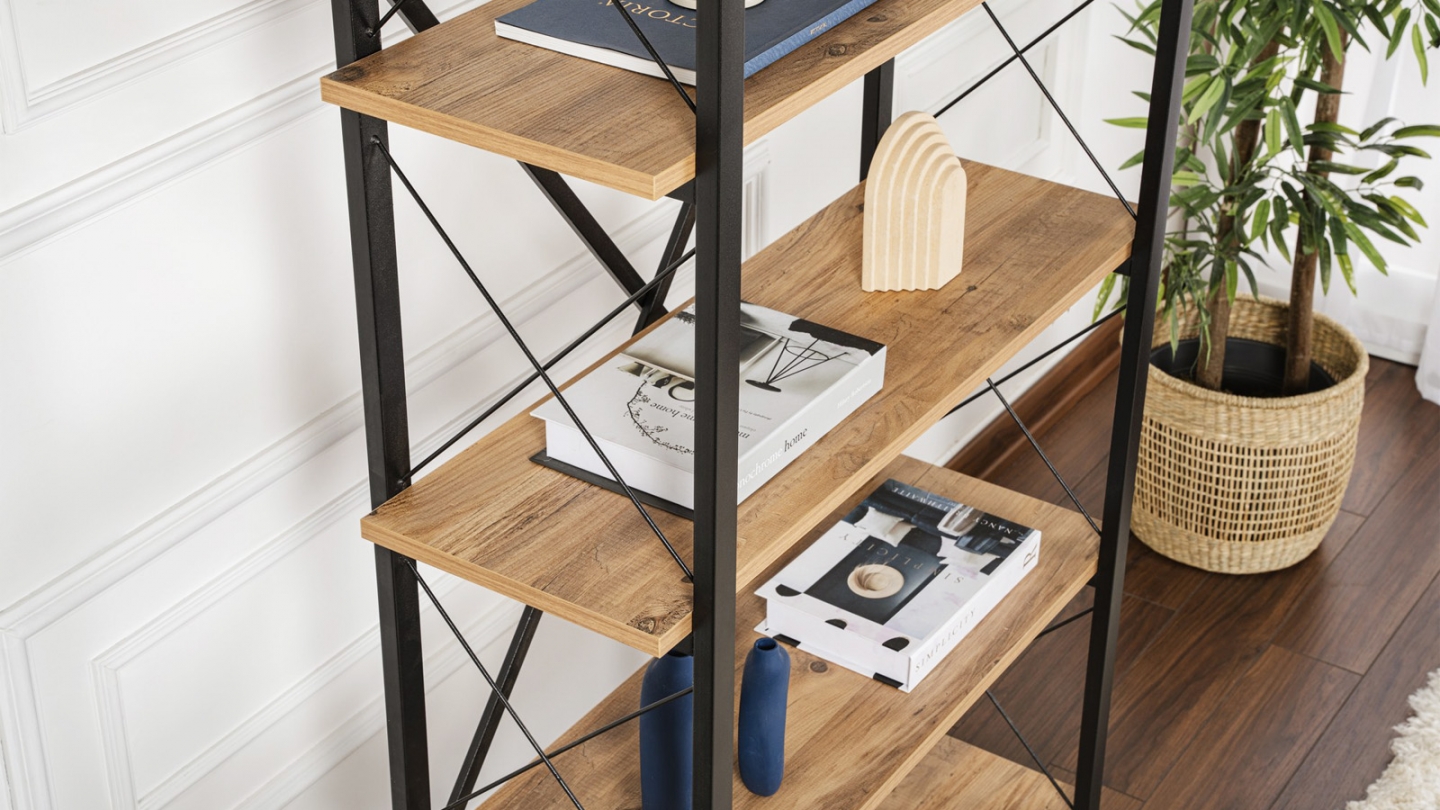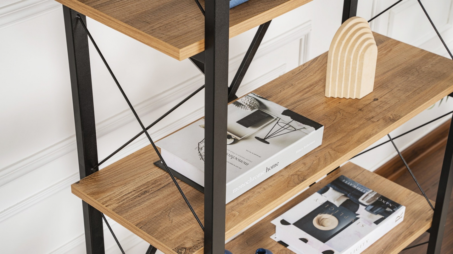 En stockBibliothèque 4 niveaux - Rita • Structure en métal noir • Étagères en mélamine effet chêne • Hauteur du piètement : 21.2 cm • Rangements : 6 niches • Dimensions totales : 58 x 35 x 175 cm