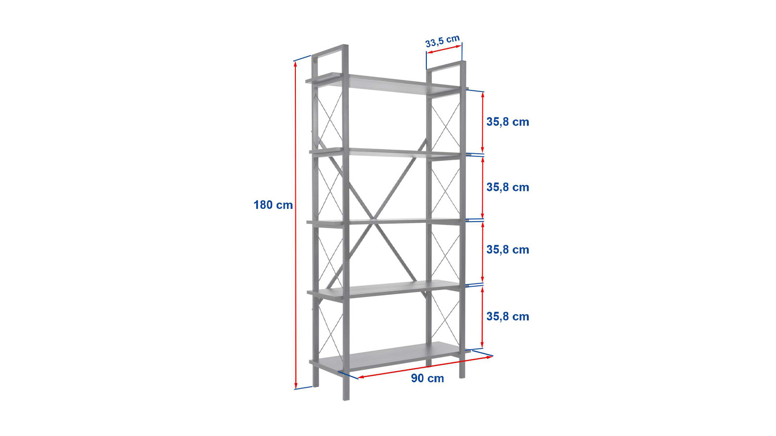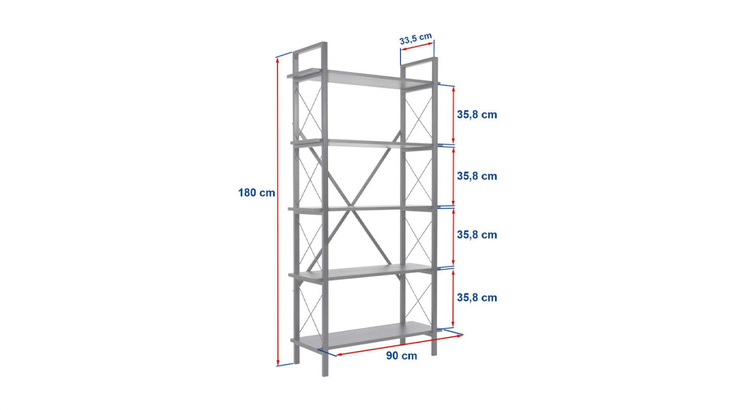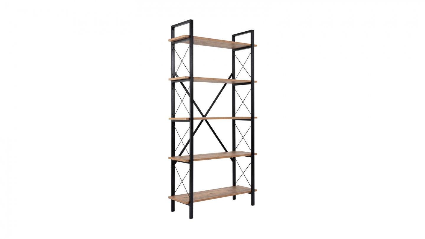 Etagère / Bibliothèque - Lunea• Matière : Mélamine, métal• Couleur : Etagères Effet Noyer - Piètement noir• Design industriel mêlant structure en métal noir et plateaux effet bois, pour un rangement aérien et contemporain. Espacement entre les étagères : 35,8 cm.• Rangements : 5 tablettes• Dimensions totales : 90 x 33.5 x 180 cm