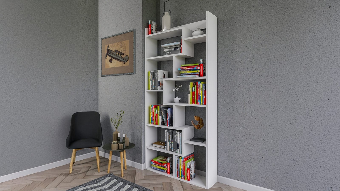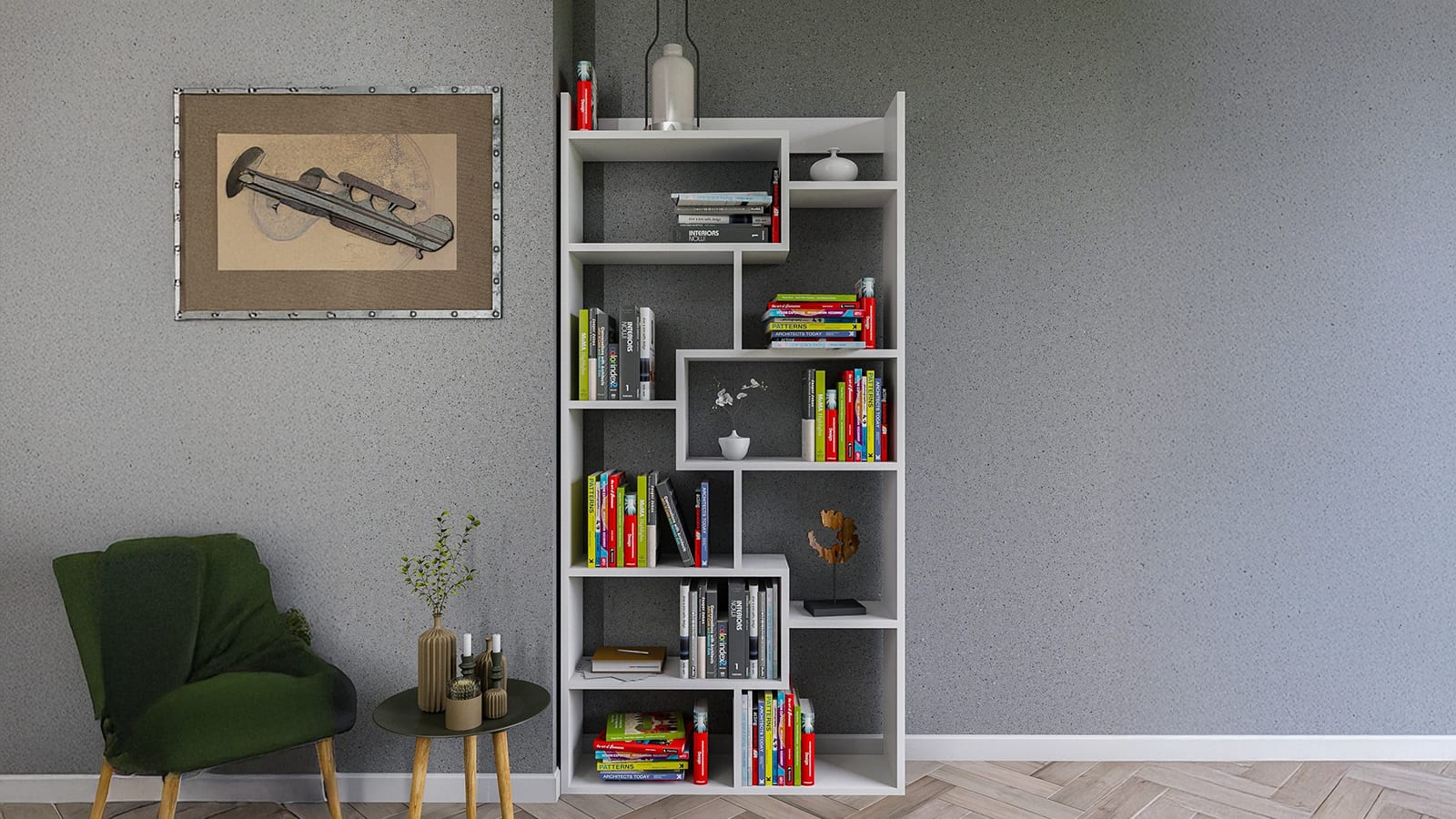 • Bibliothèque au design géométrique original, parfaite pour exposer livres et objets déco tout en structurant élégamment l’espace.