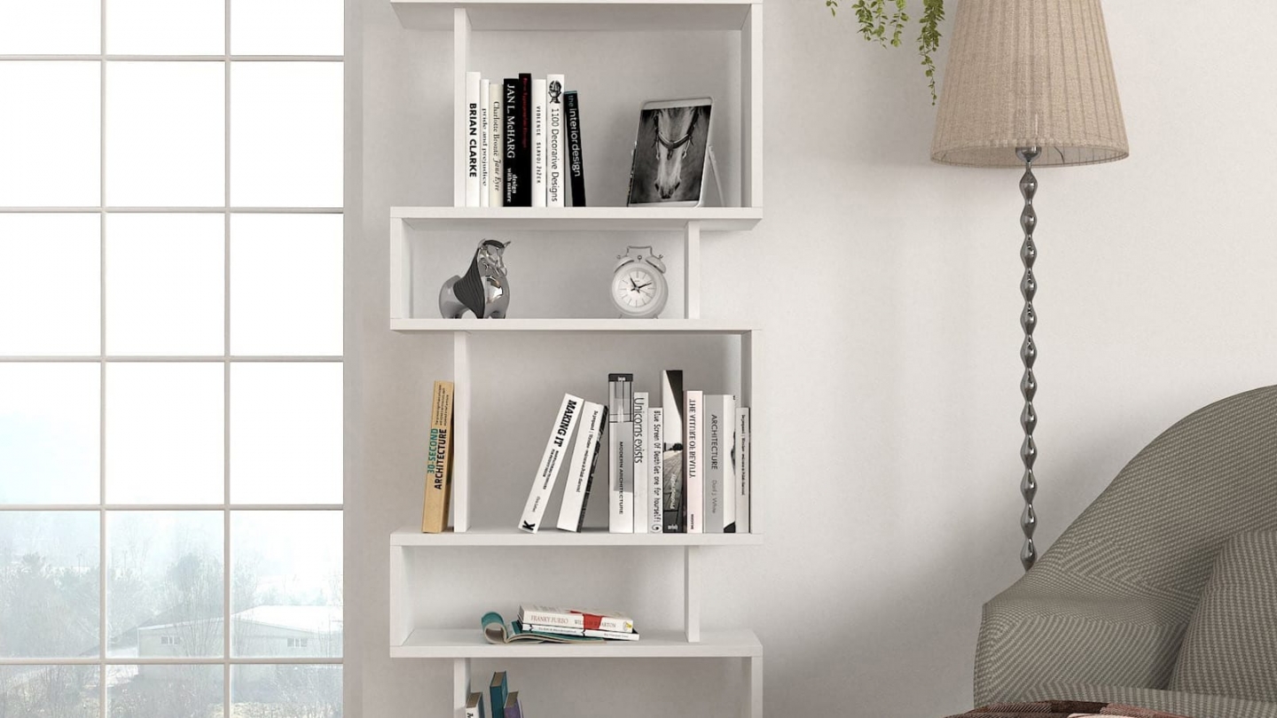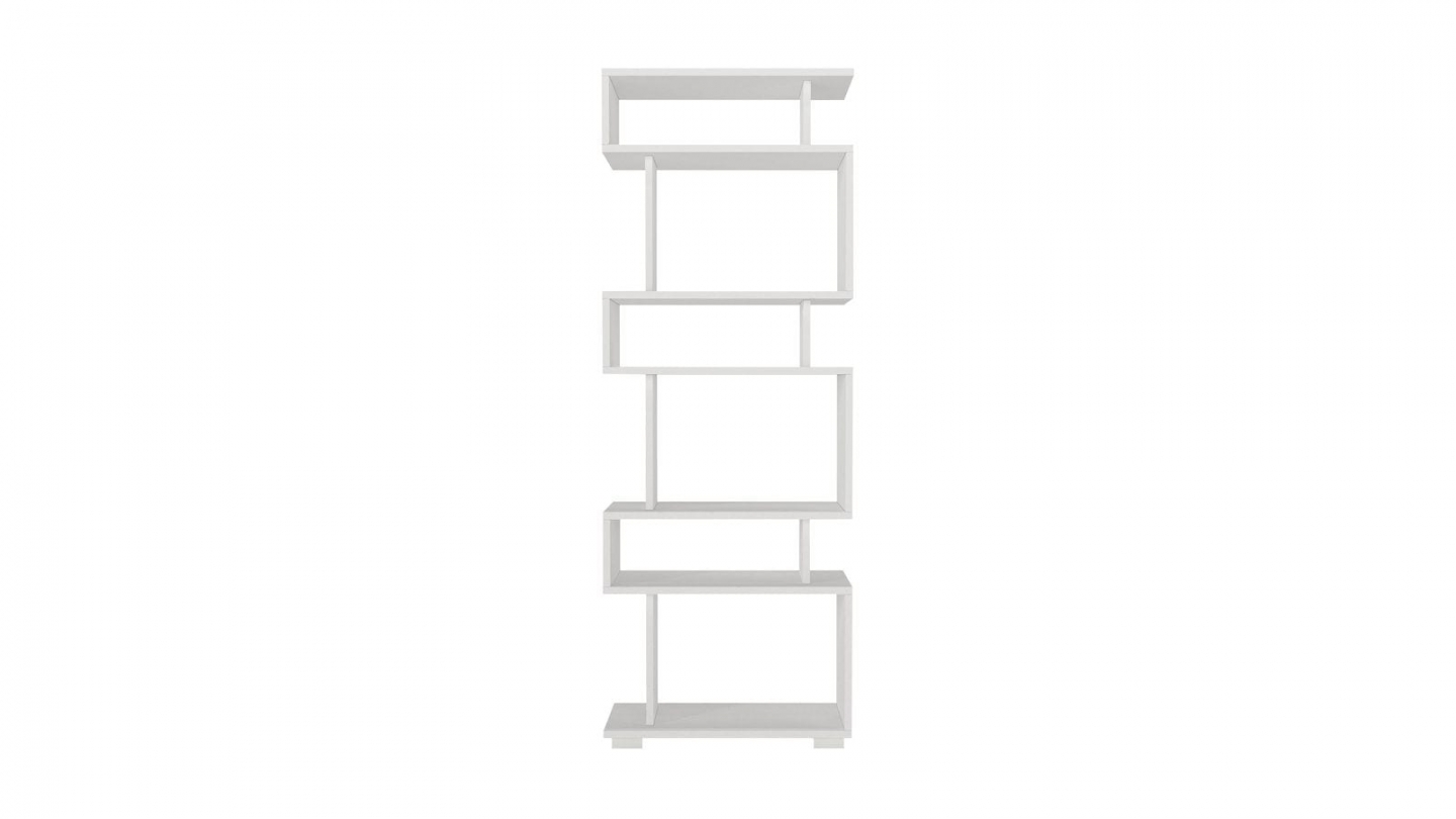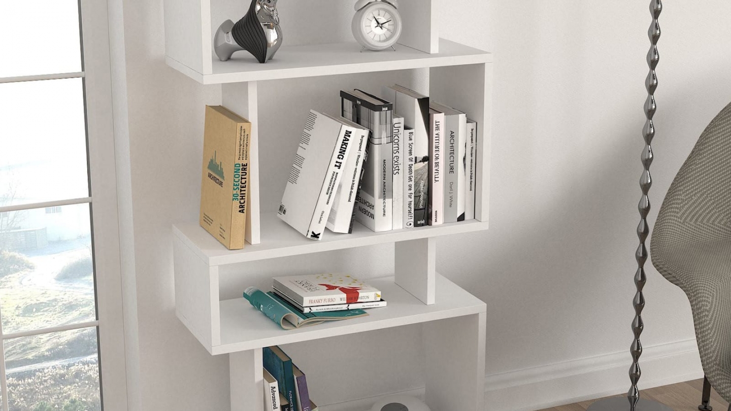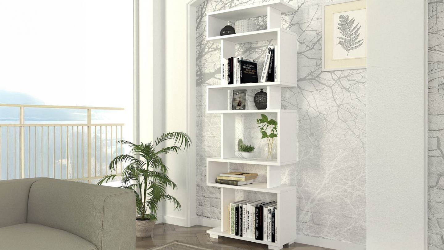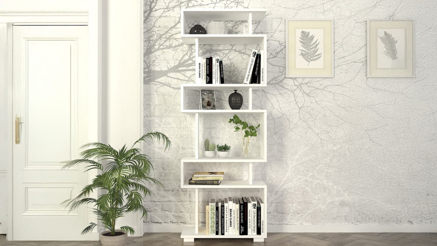 • Bibliothèque blanche au design décalé et graphique, idéale pour exposer livres et objets déco tout en apportant une touche moderne à la pièce.
