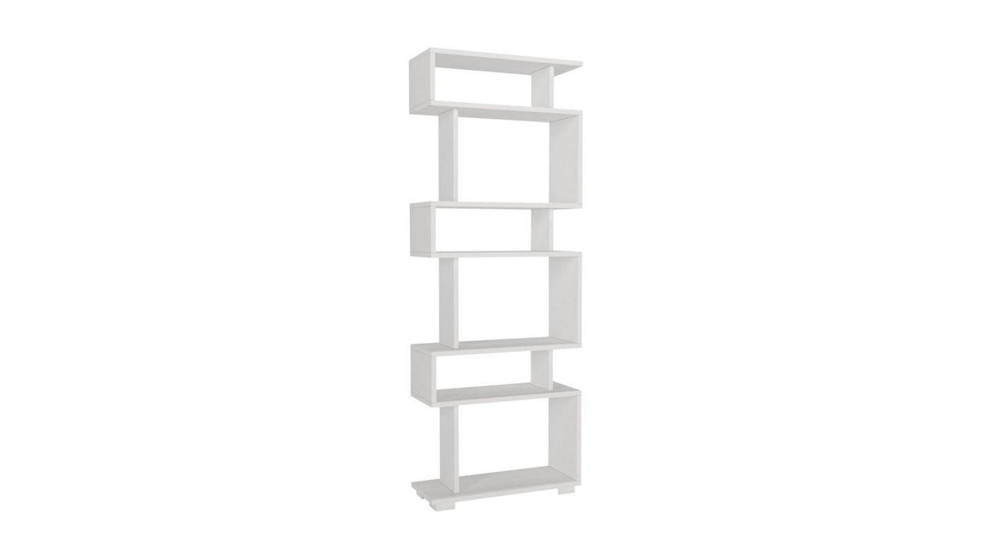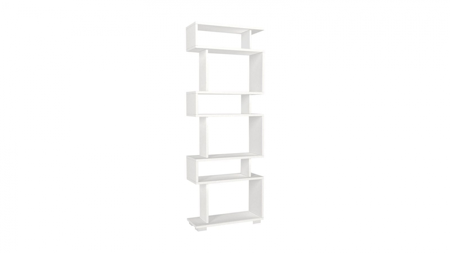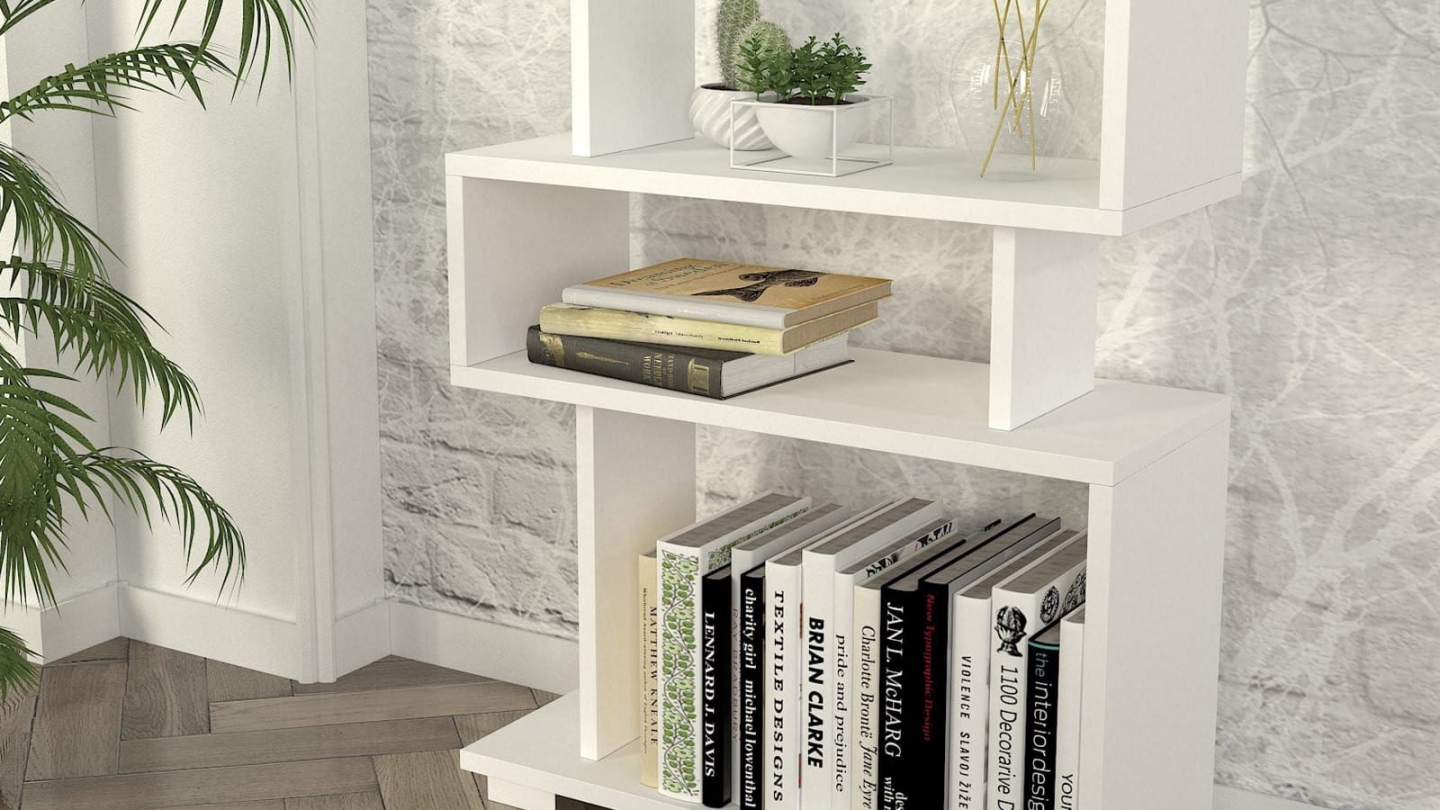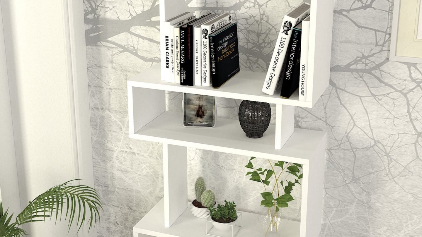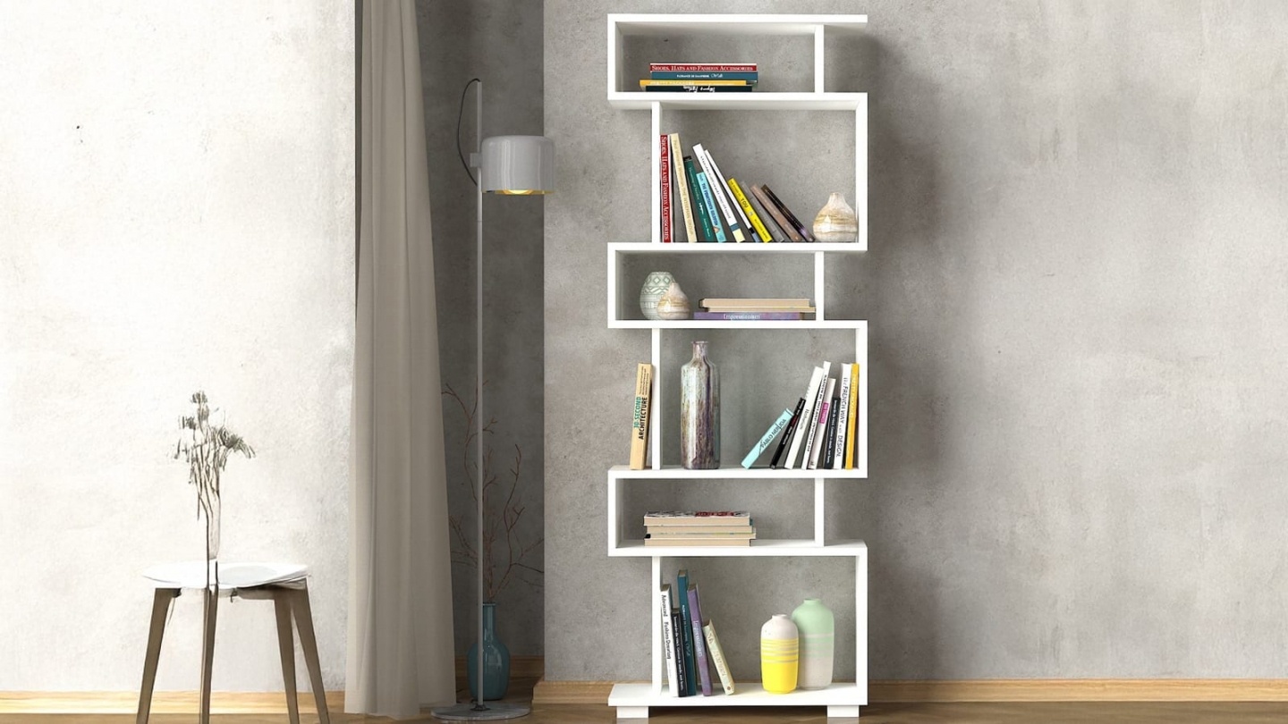 • Bibliothèque blanche au design décalé et graphique, idéale pour exposer livres et objets déco tout en apportant une touche moderne à la pièce.
