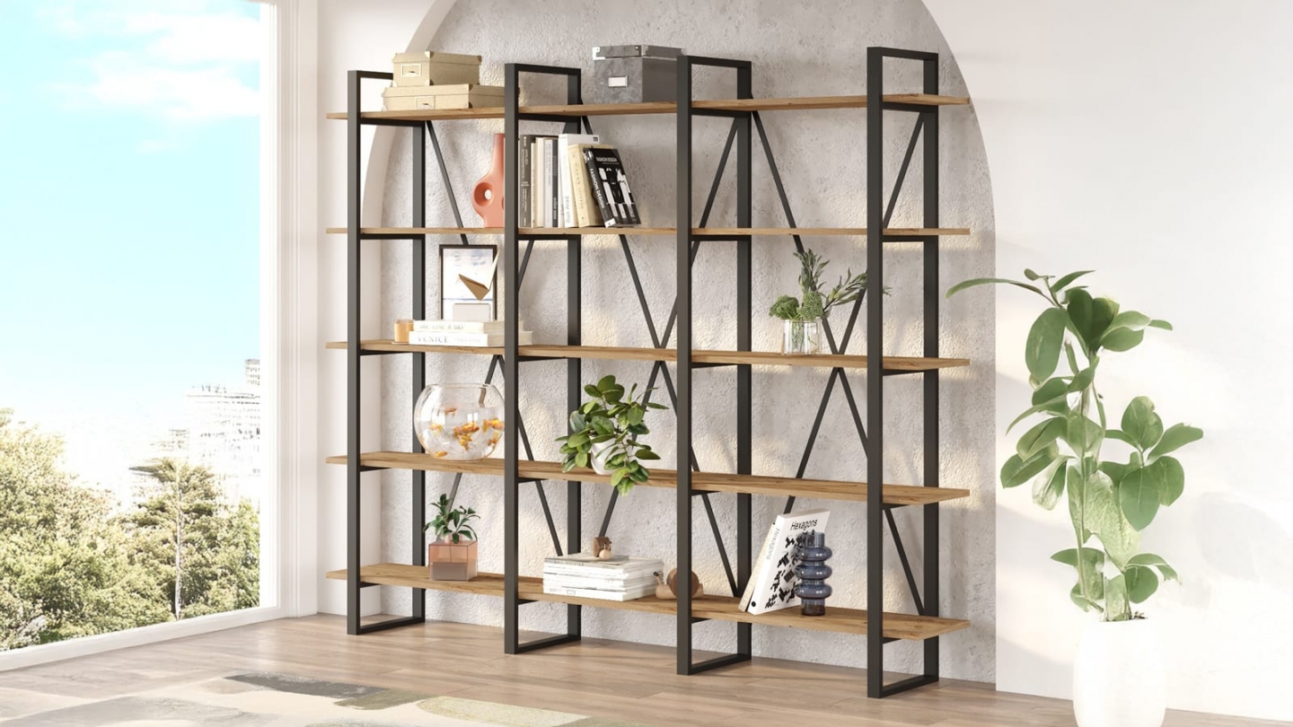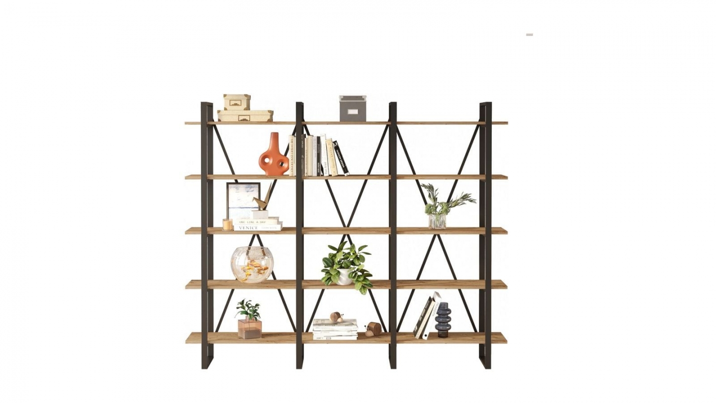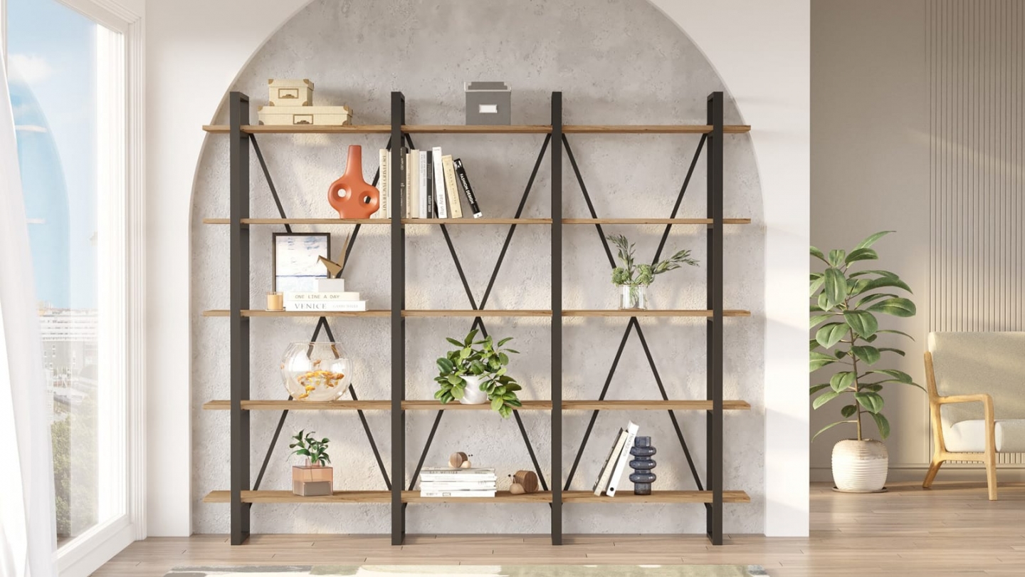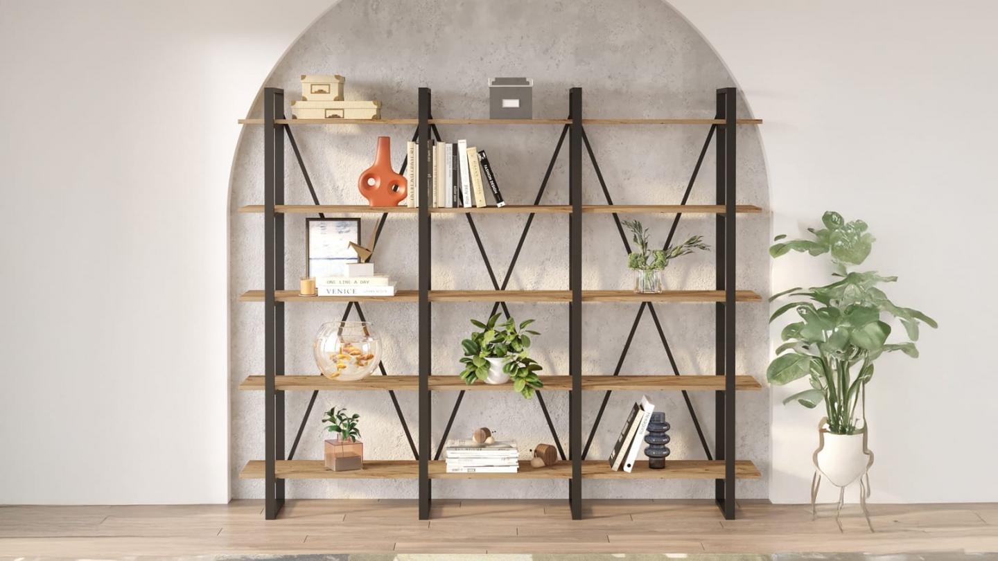 • Grande étagère au style industriel, parfaite pour exposer livres et objets déco tout en structurant l’espace avec légèreté.