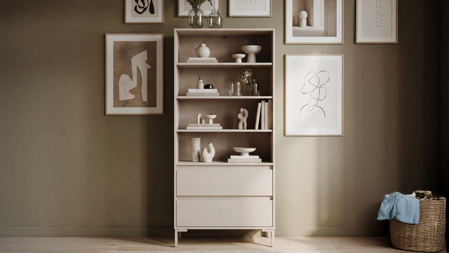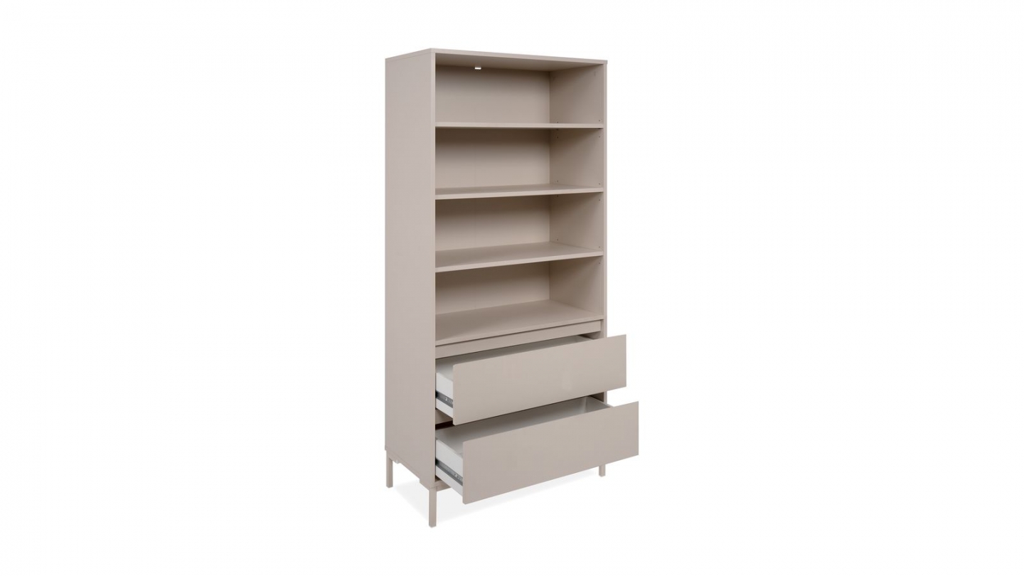 Etagère / Bibliothèque - Lise • Matière : Mélamine, métal • Couleur : Beige • Piètement en métal noir • Rangements : 4 niches, 5 portes battantes, 4 tablettes • Dimensions totales : 84 x 34 x 175 cm • Poids net : 52,5 kg