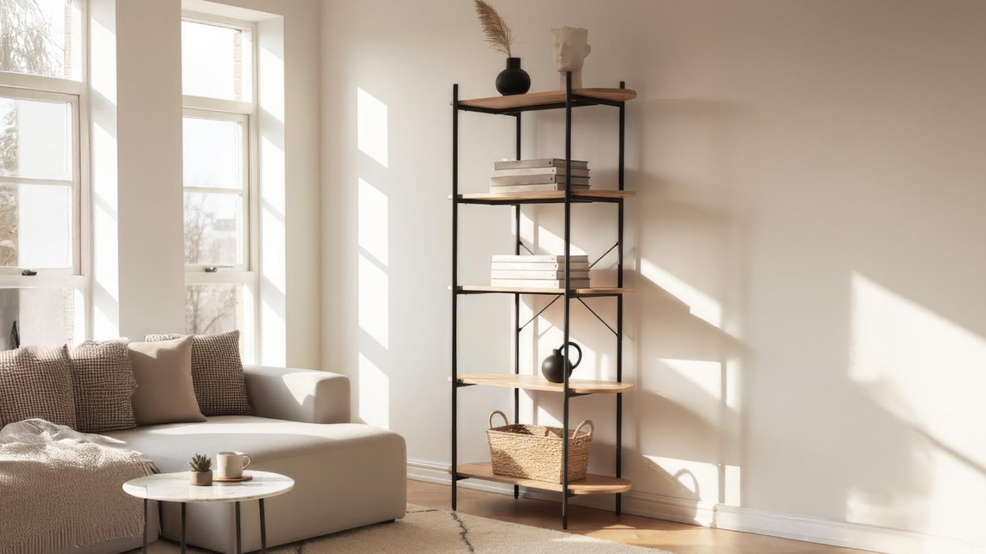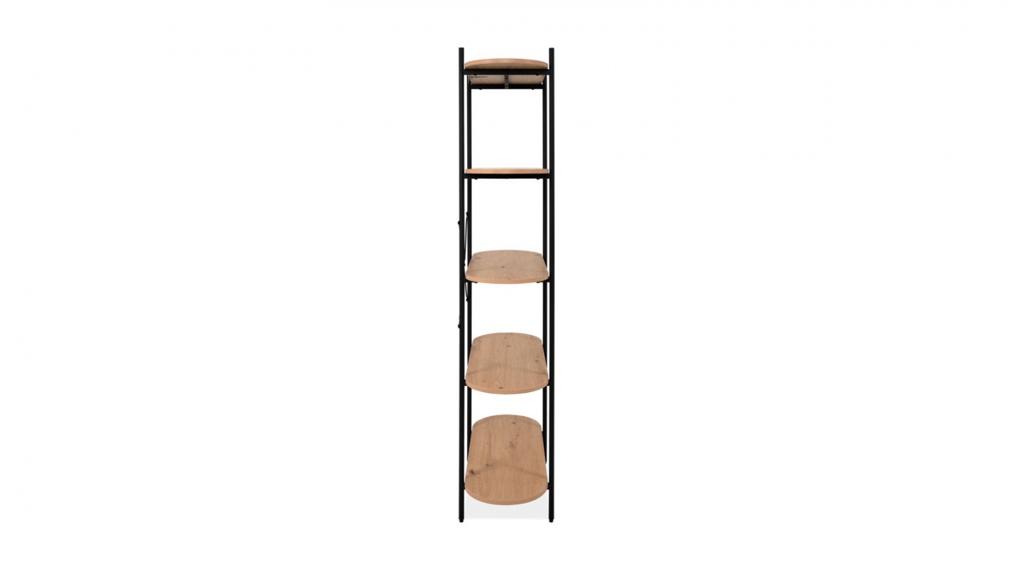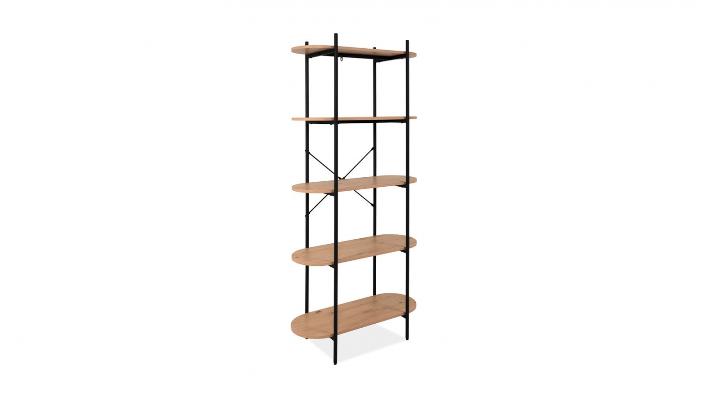 En stockEtagère / Bibliothèque - Lunea• Matière : Mélamine, métal• Couleur : Effet bois - Piètement noir• Design industriel mêlant structure en métal noir et plateaux effet bois, pour un rangement aérien et contemporain. Espacement entre les étagères : 35,8 cm.• Rangements : 5 tablettes• Dimensions totales : 90 x 33.5 x 180 cm