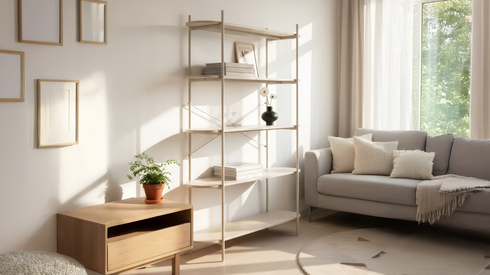 Etagère / Bibliothèque - Elie • Matière : Métal, panneau de particules • Couleur : Beige et décor bois • Piètement en métal beige • Rangements : 5 tablettes, 6 box • Dimensions totales : 139.5 x 39 x 179 cm • Poids net : 81,15 kg