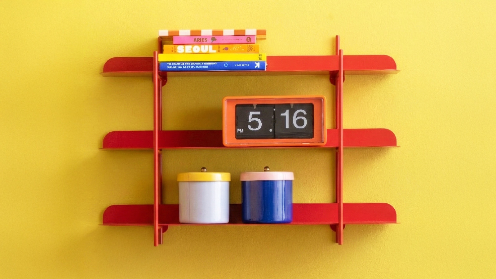 Une étagère murale en métal au look rétro graphique (H 42 cm × P 16 cm), parfaite pour exposer vos trésors et organiser vos espaces avec style.