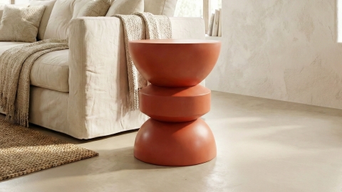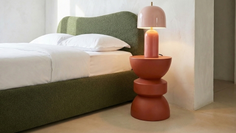 Décliné ici dans une finition terracotta mat, Elin apporte une note chaleureuse et naturelle à la décoration. Cette teinte minérale, inspirée des tons de la terre, crée une atmosphère accueillante et authentique, idéale pour réchauffer un salon ou une chambre. Sa texture mate souligne son caractère sculptural et met en valeur ses lignes arrondies. Grâce à son format compact, il peut être utilisé aussi bien comme bout de canapé que comme table de chevet, offrant une surface pratique pour accueillir lampe, livres ou objets du quotidien.