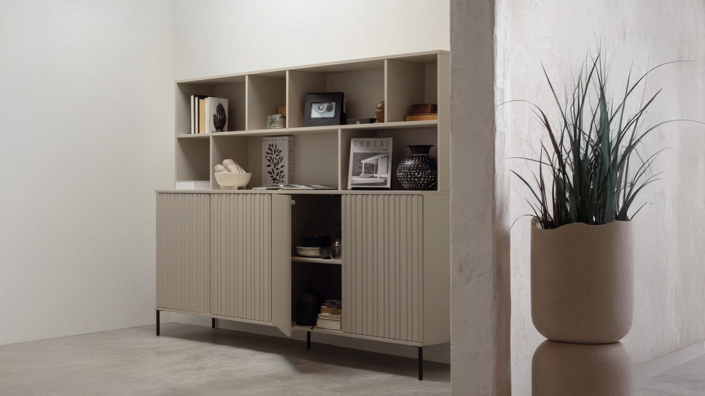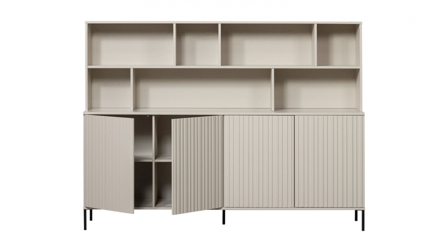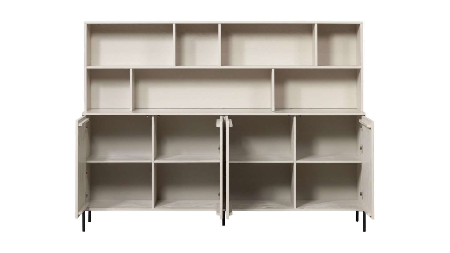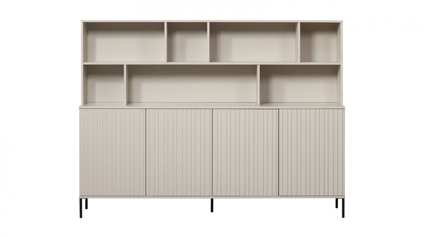 • Compartiments ouverts pour exposer vos objets déco + 4 portes en relief pour du rangement discret