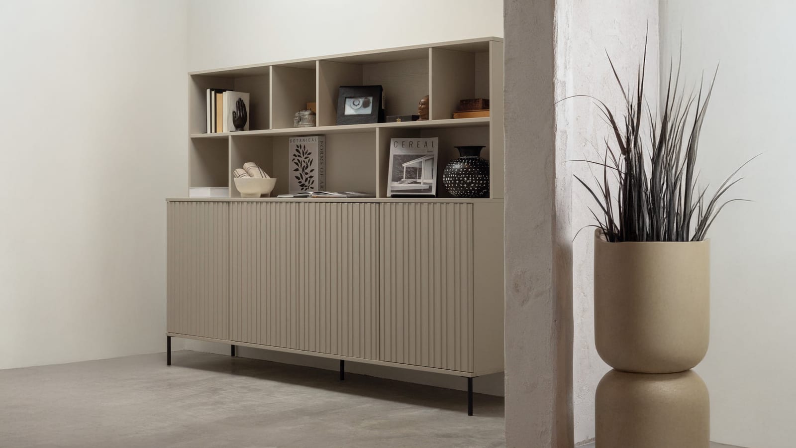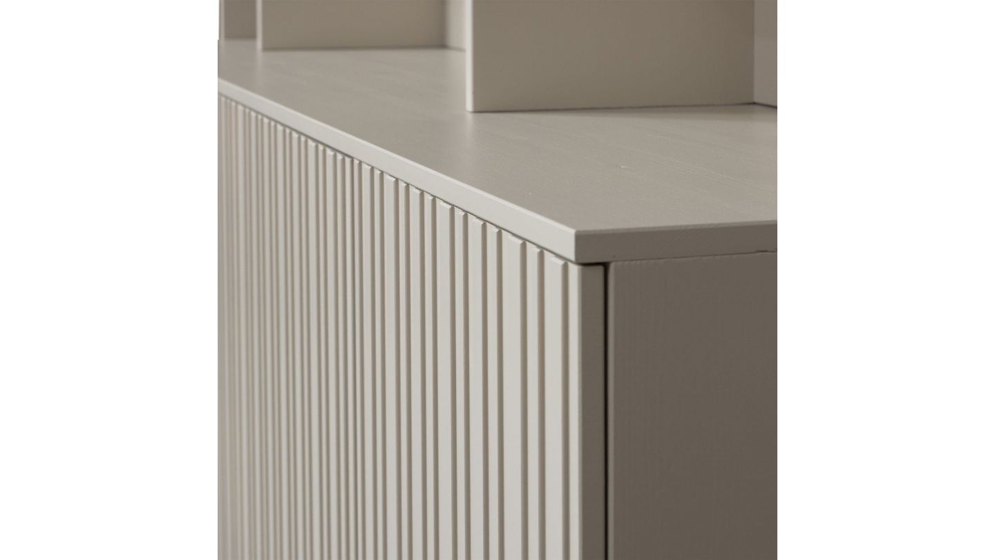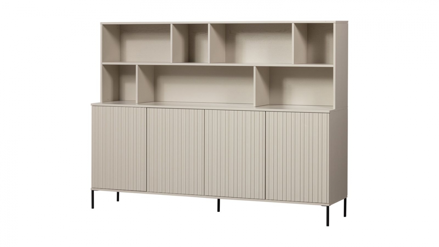 • Compartiments ouverts pour exposer vos objets déco + 4 portes en relief pour du rangement discret