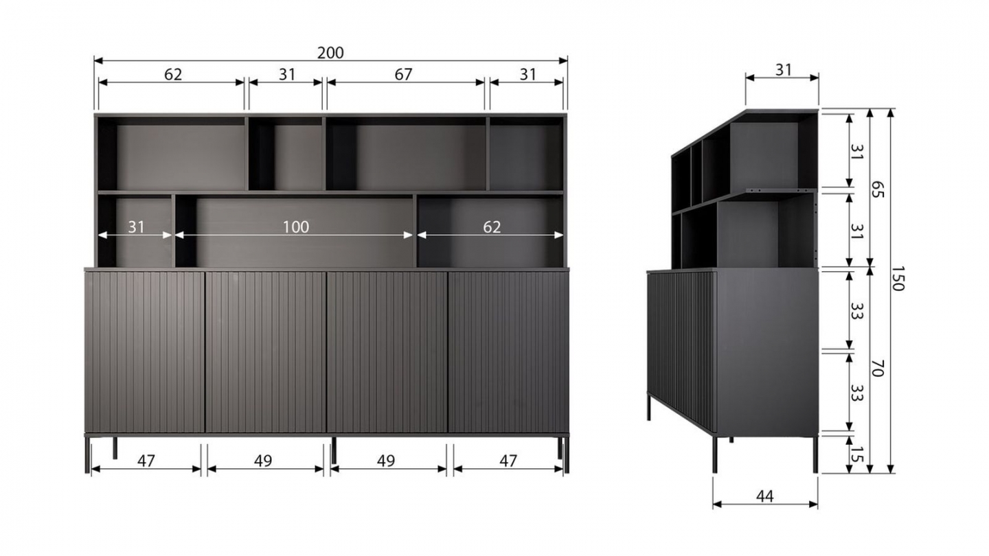 • Dimensions : L 200 x P 44 x H 150 cm – Volume généreux, idéal pour les grandes pièces