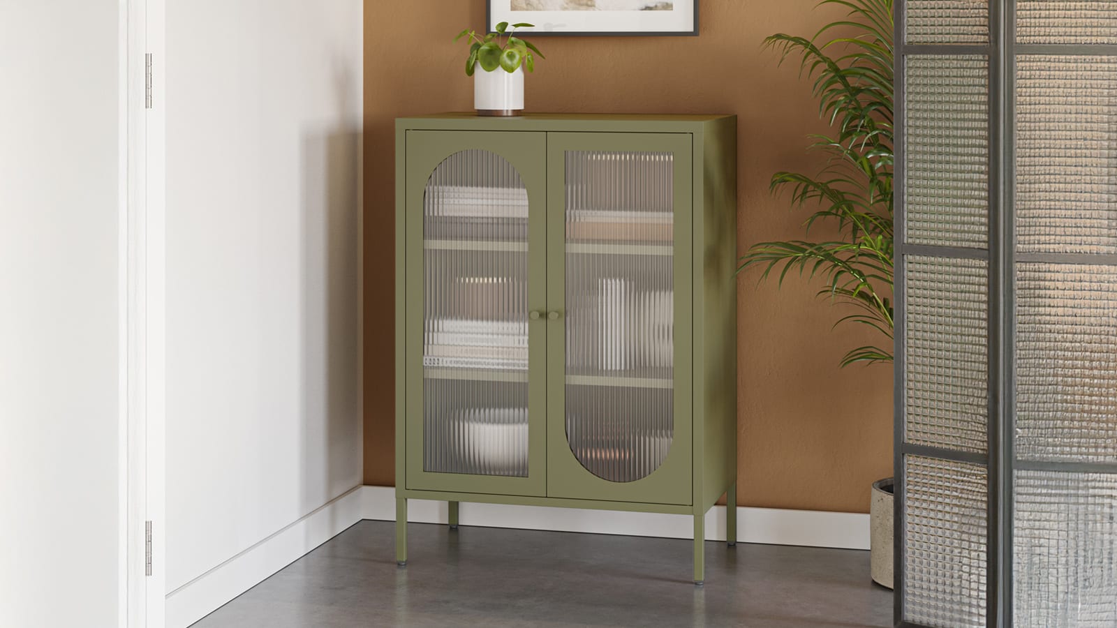 Buffet haut / Vaisselier - Ysia• Matière : Métal• Couleur : Vert• Portes ajourées avec empiècements géométriques en verre texturé pour une touche architecturale art déco revisitée• Piètement et poignées en métal vert• Rangements : 4 portes battantes, 1 tablette• Dimensions totales : 160 x 40 x 90 cm• Poids net : 32.5 kg
