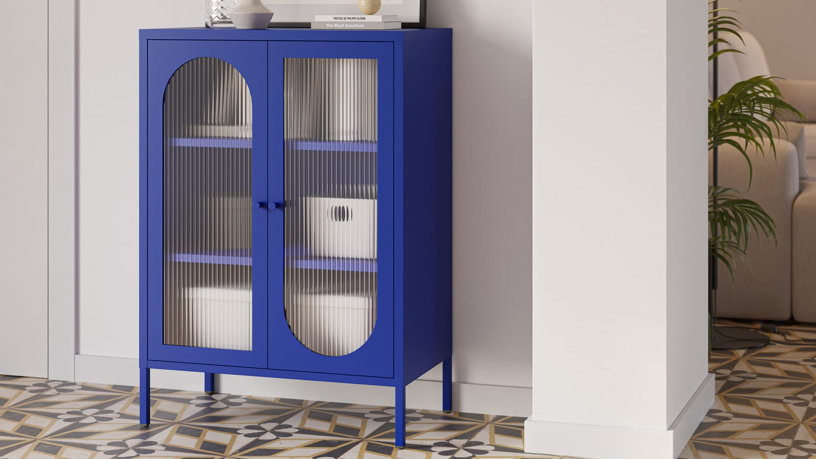 Meuble TV - Ysia• Matière : Métal• Couleur : Bleu électrique• Portes ajourées avec empiècements géométriques en verre texturé pour une touche architecturale art déco revisitée• Piètement et poignées en métal bleu électrique• Rangements : 2 niches, 2 portes battantes, 1 tablette• Dimensions totales : 160 x 35 x 50 cm• Avec passe câblePoids net : 19 kg