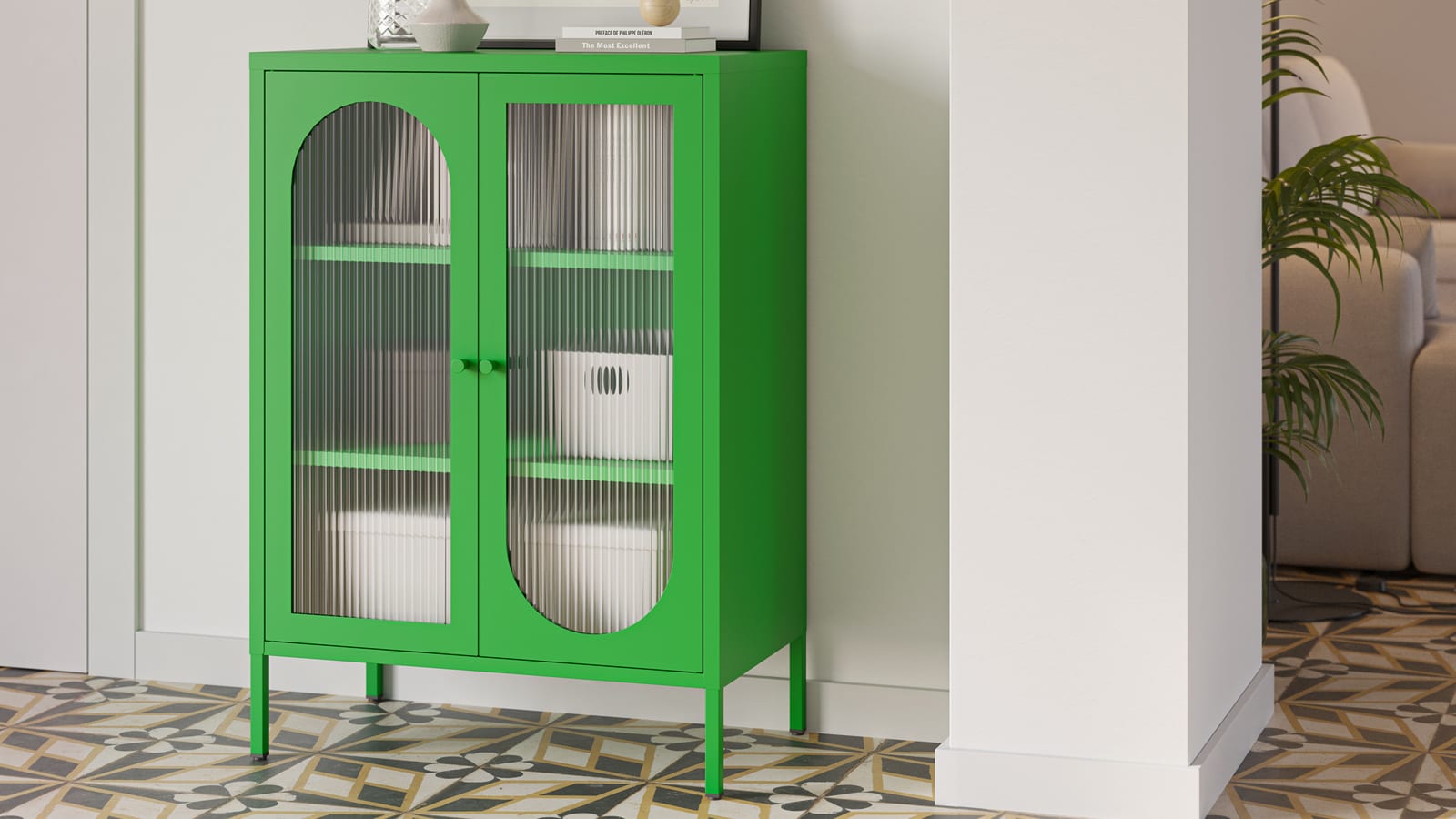 Buffet - Ysia• Matière : Métal• Couleur : Vert• Portes ajourées avec empiècements géométriques en verre texturé pour une touche architecturale art déco revisitée• Piètement et poignées en métal vert• Rangements : 2 portes battantes, 2 tablettes• Dimensions totales : 70 x 40 x 100 cm• Poids net : 18.5 kg