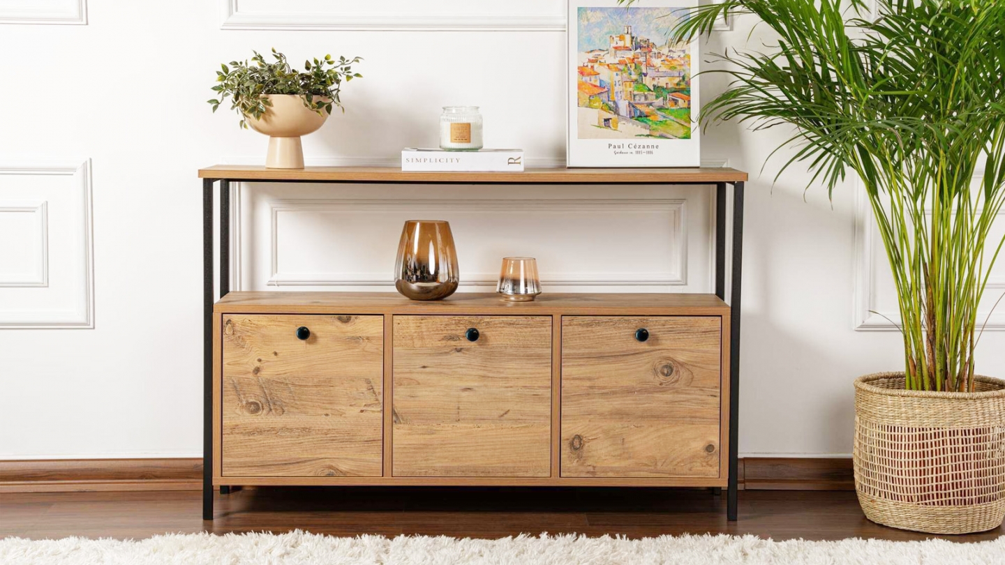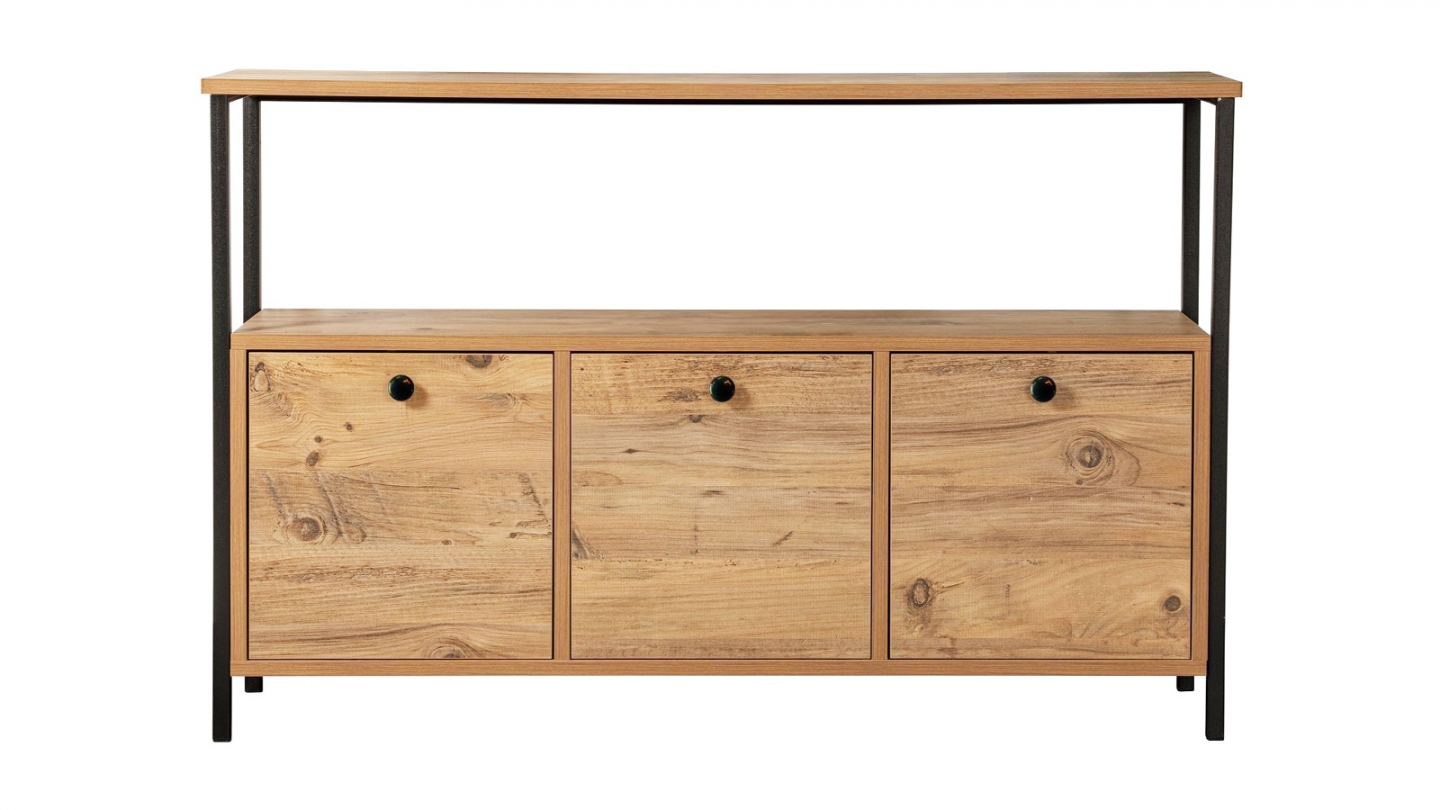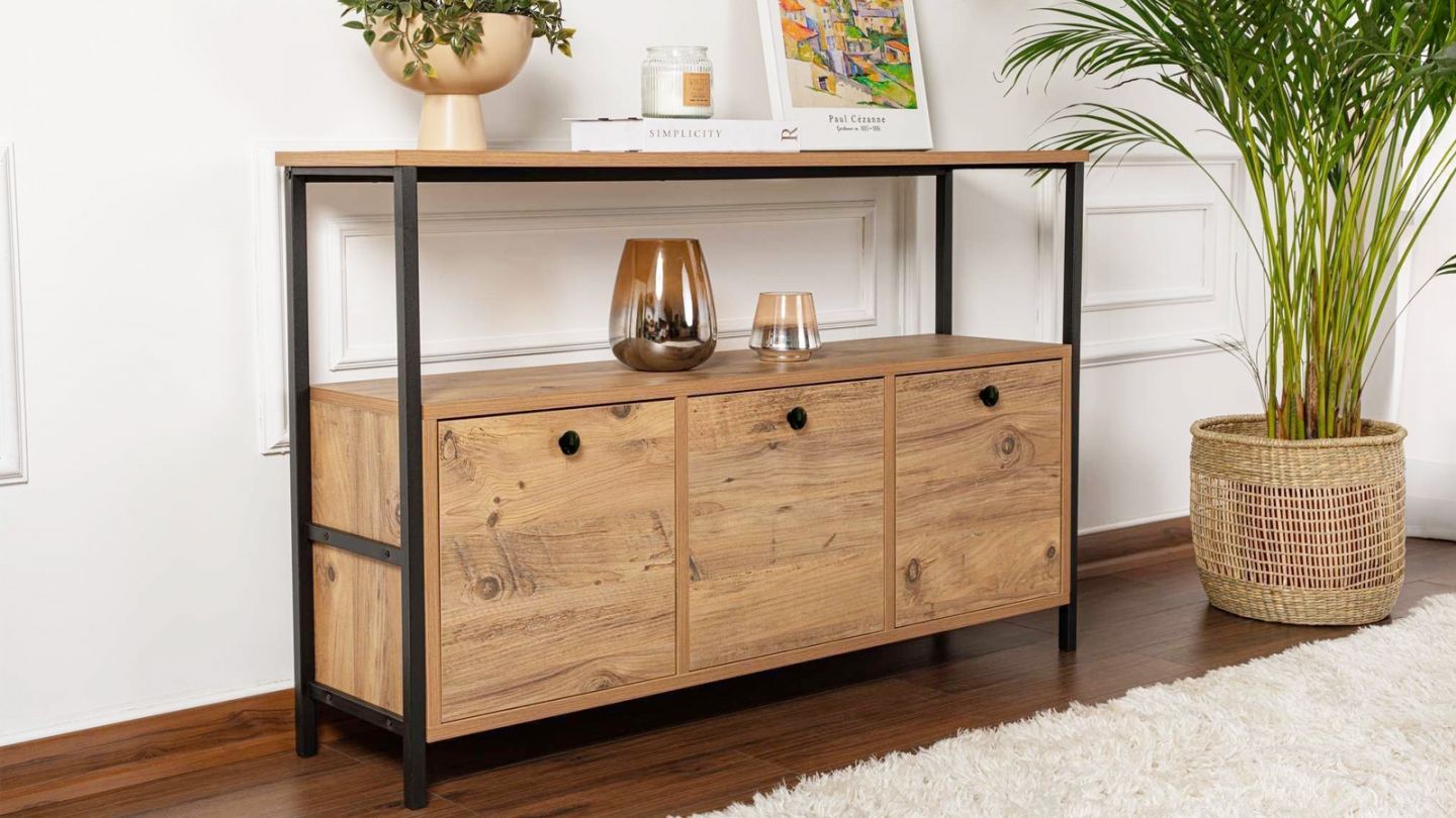 • Petit buffet 2 portes 3 tiroirs 120 cm• Matière : panneaux de particules, mélaminé• Couleur : Naturel effet chêne• 2 portes, 1 tablette et 3 tiroirs• Piétement en Métal• Dimensions totales : 120 x 40 x 87 cm• Garantie 2 ans