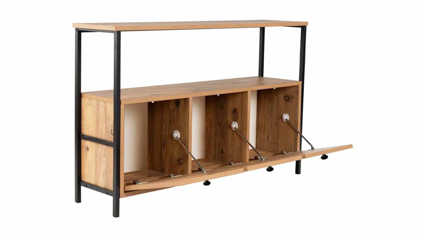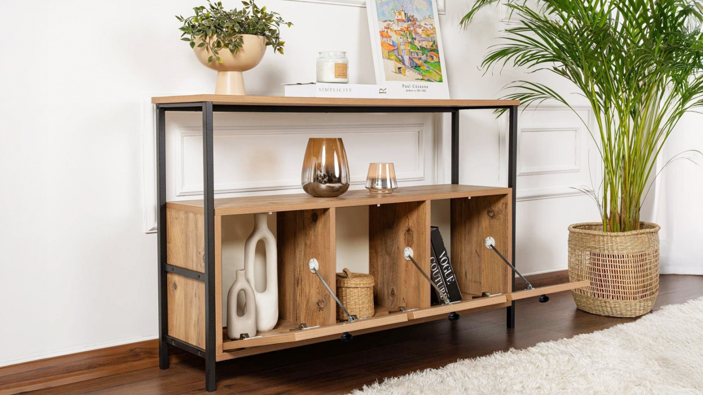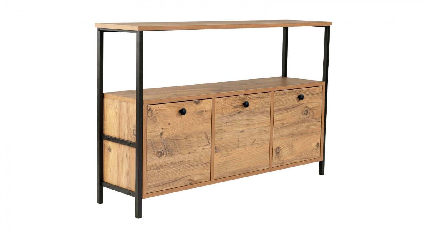Buffet - Mareva• Matière : Mélamine, Métal• Couleur : Effet bois foncé - Piètement noir• Buffet au style industriel et chaleureux, combinant une structure en métal noir à un décor bois naturel. Ses trois portes abattantes offrent un large espace de rangement, tandis que son plateau et sa niche ouverte permettent d’exposer objets déco et livres avec...