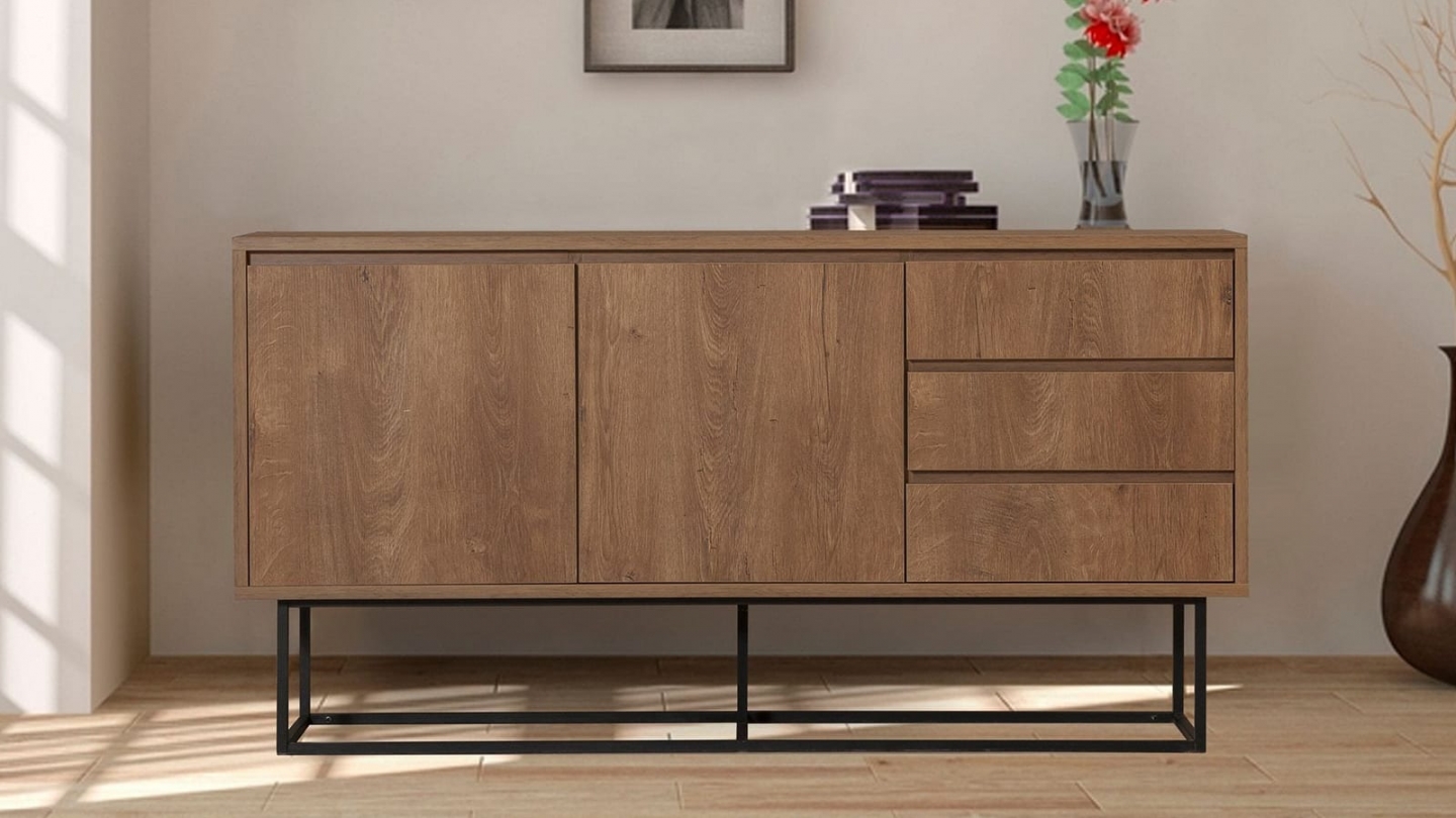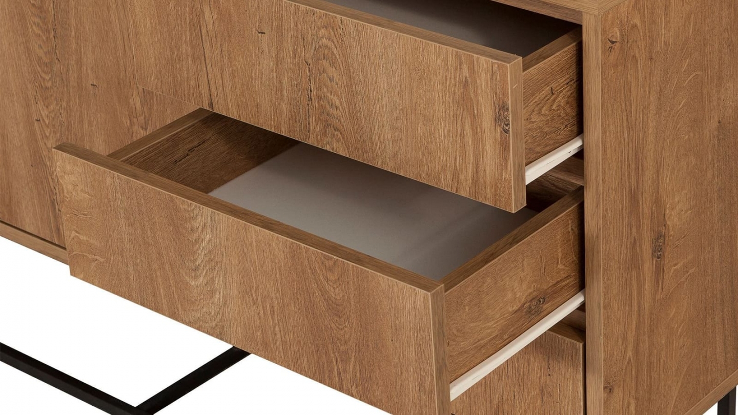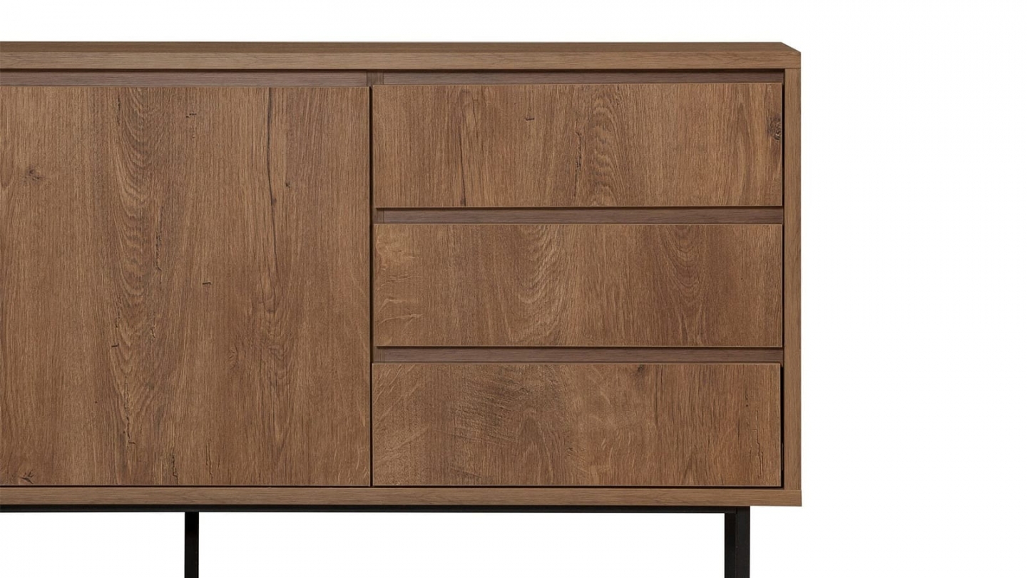 • Buffet en bois au style industriel, doté de deux portes et trois tiroirs pratiques, alliant chaleur du chêne et modernité du piètement métallique noir.