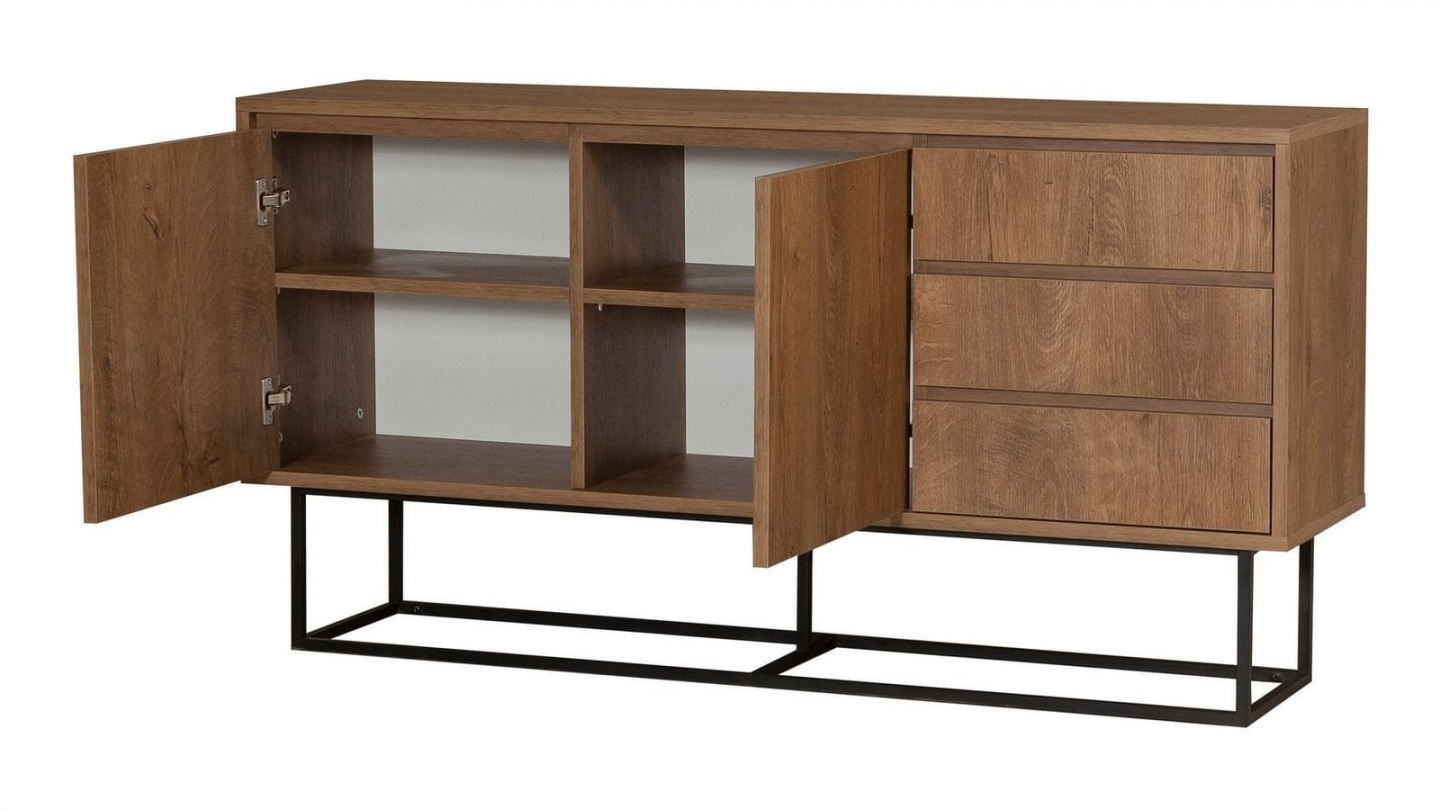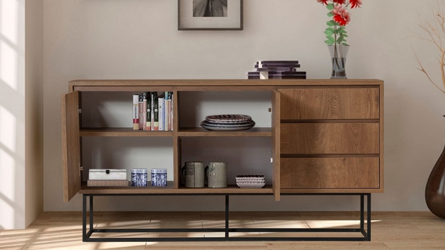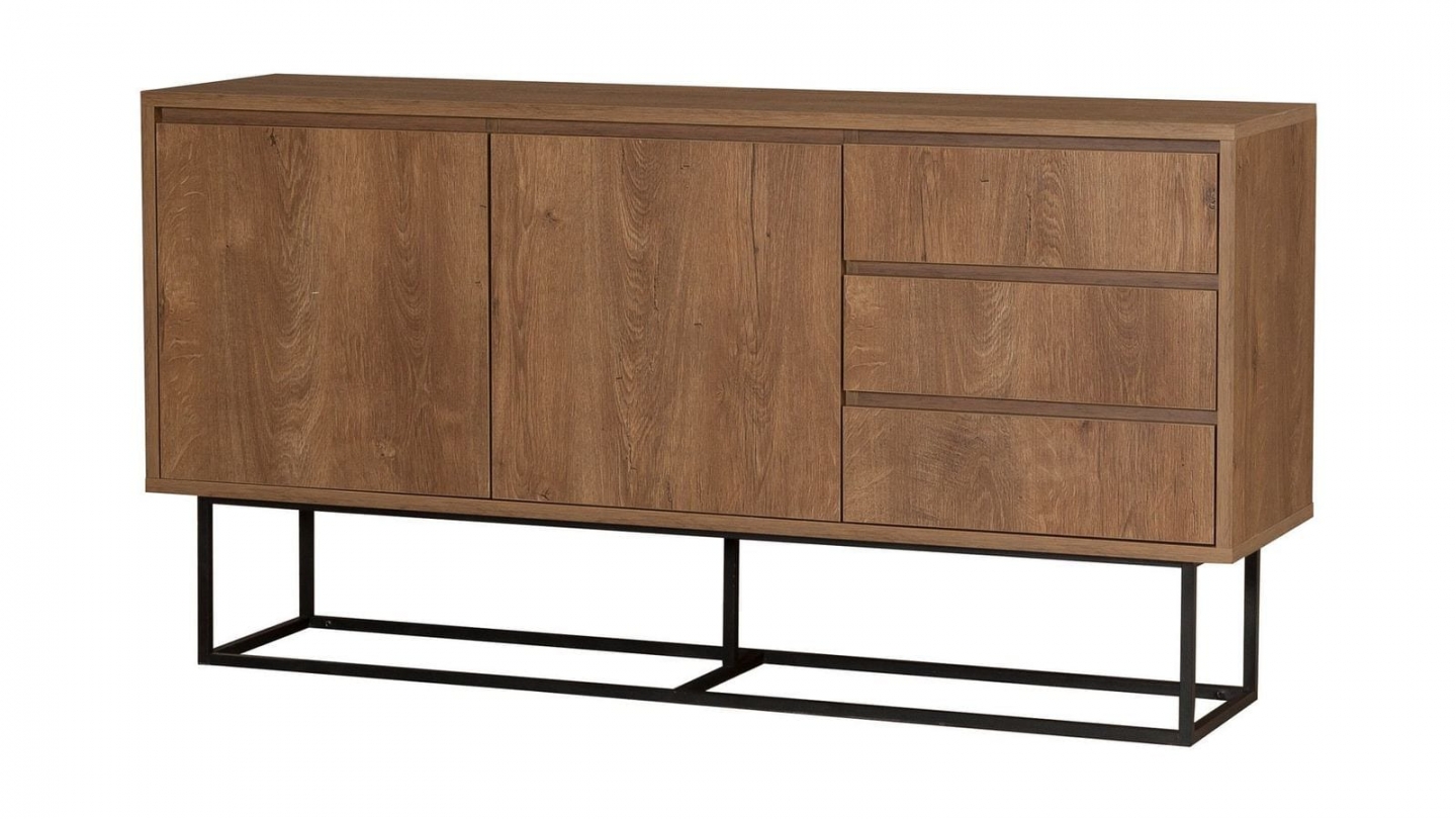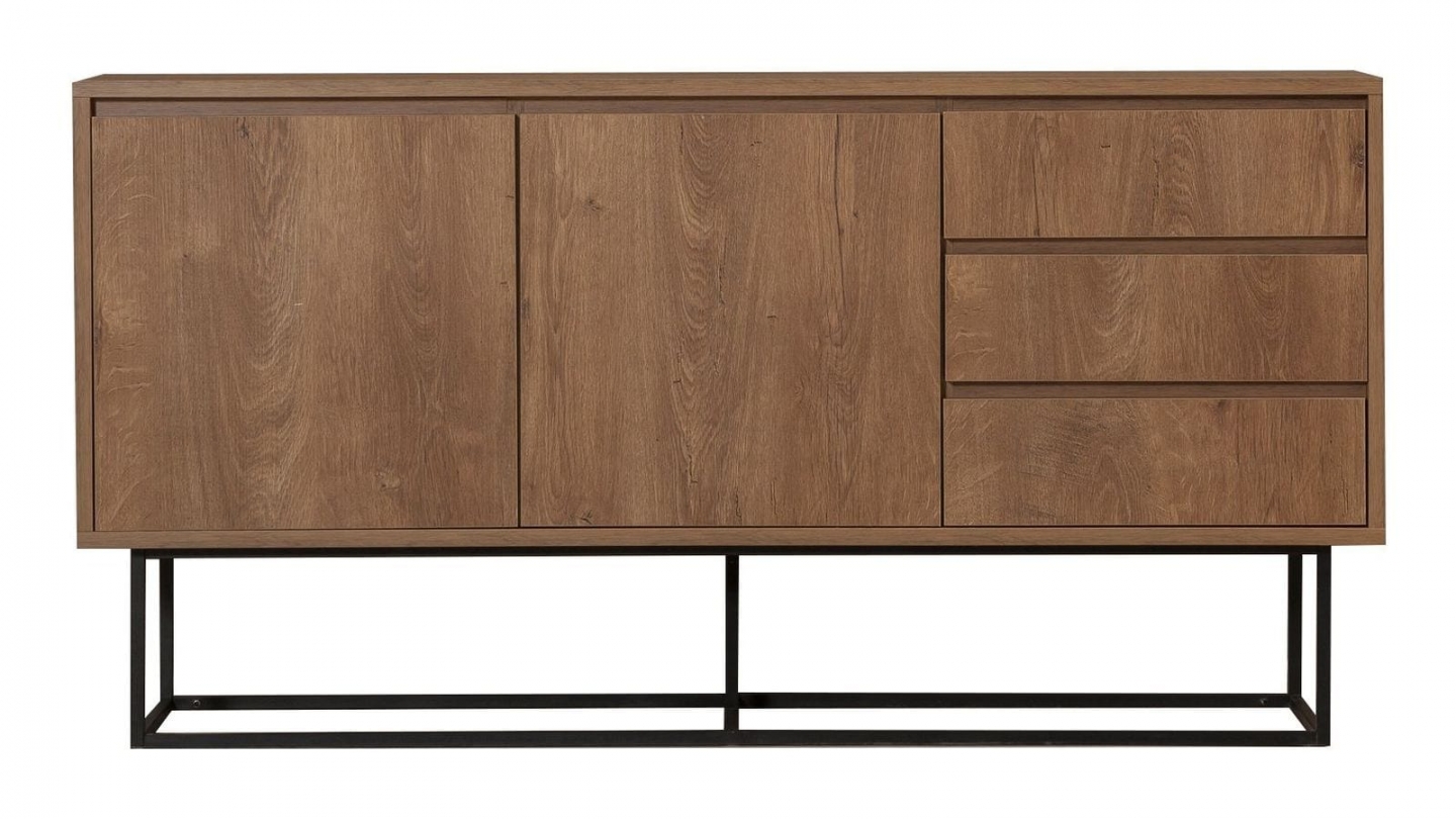 • Buffet en bois au style industriel, doté de deux portes et trois tiroirs pratiques, alliant chaleur du chêne et modernité du piètement métallique noir.