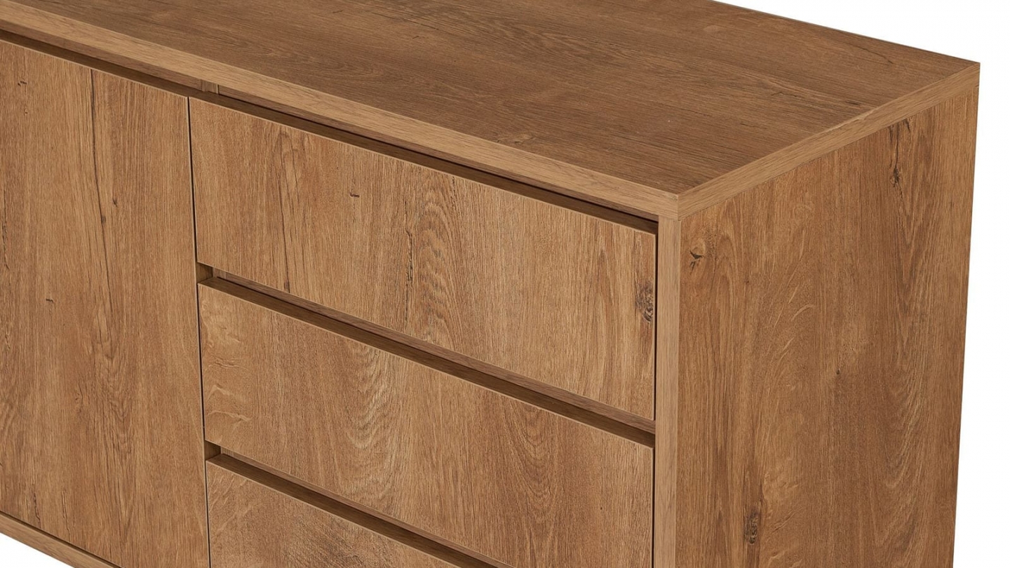 • Buffet effet chêne Sintra• Matière : panneaux de particules, mélaminé• Couleur : naturel effet chêne• Matière du piétement : plastique noir• 5 portes, 7 tablettes et 1 tiroir double• Dimensions totales : 180x42 x90cm• Garantie 2 ans