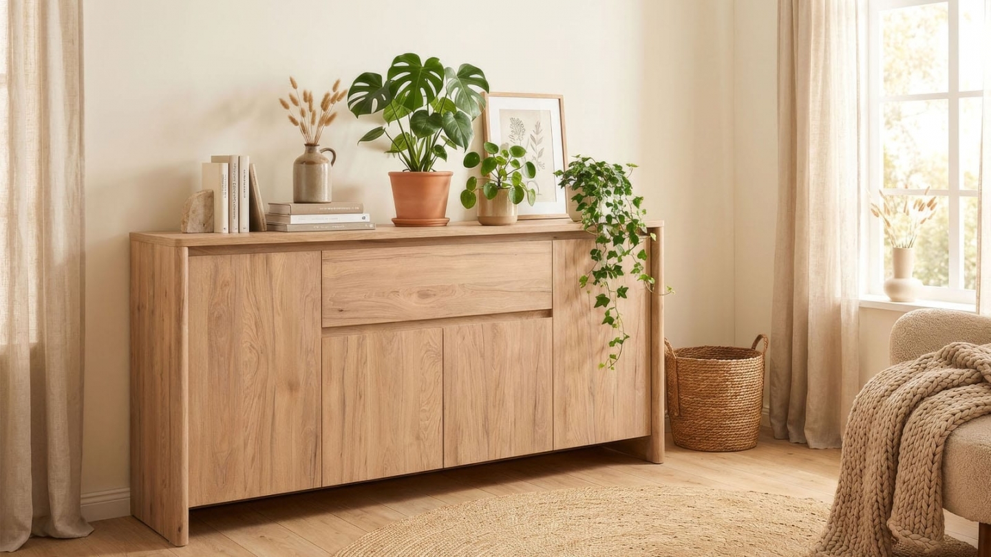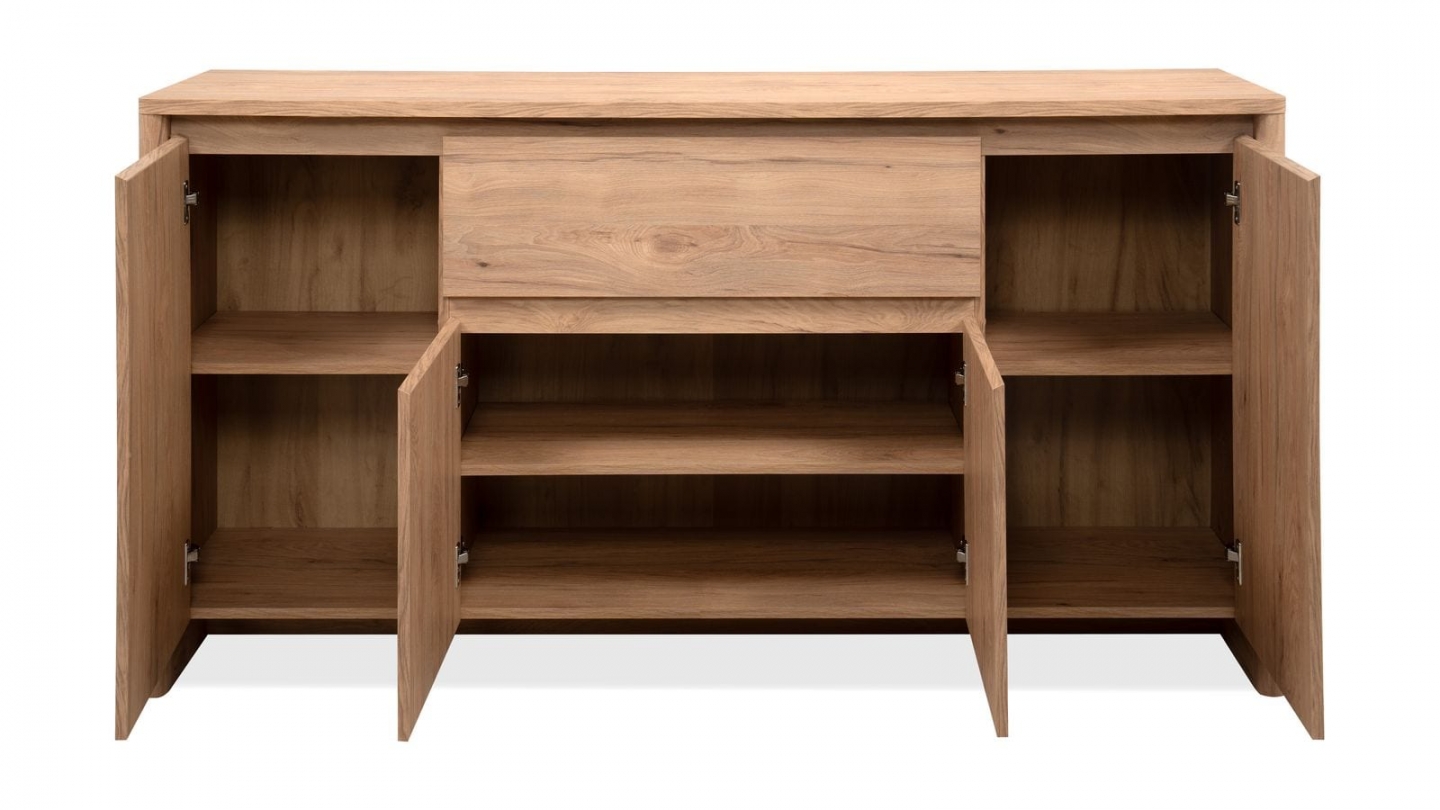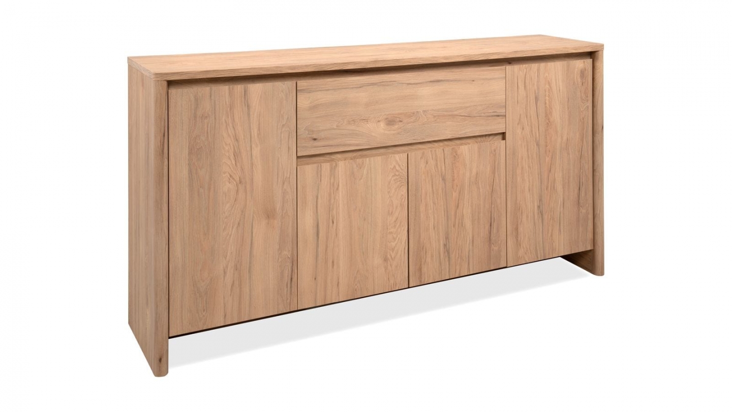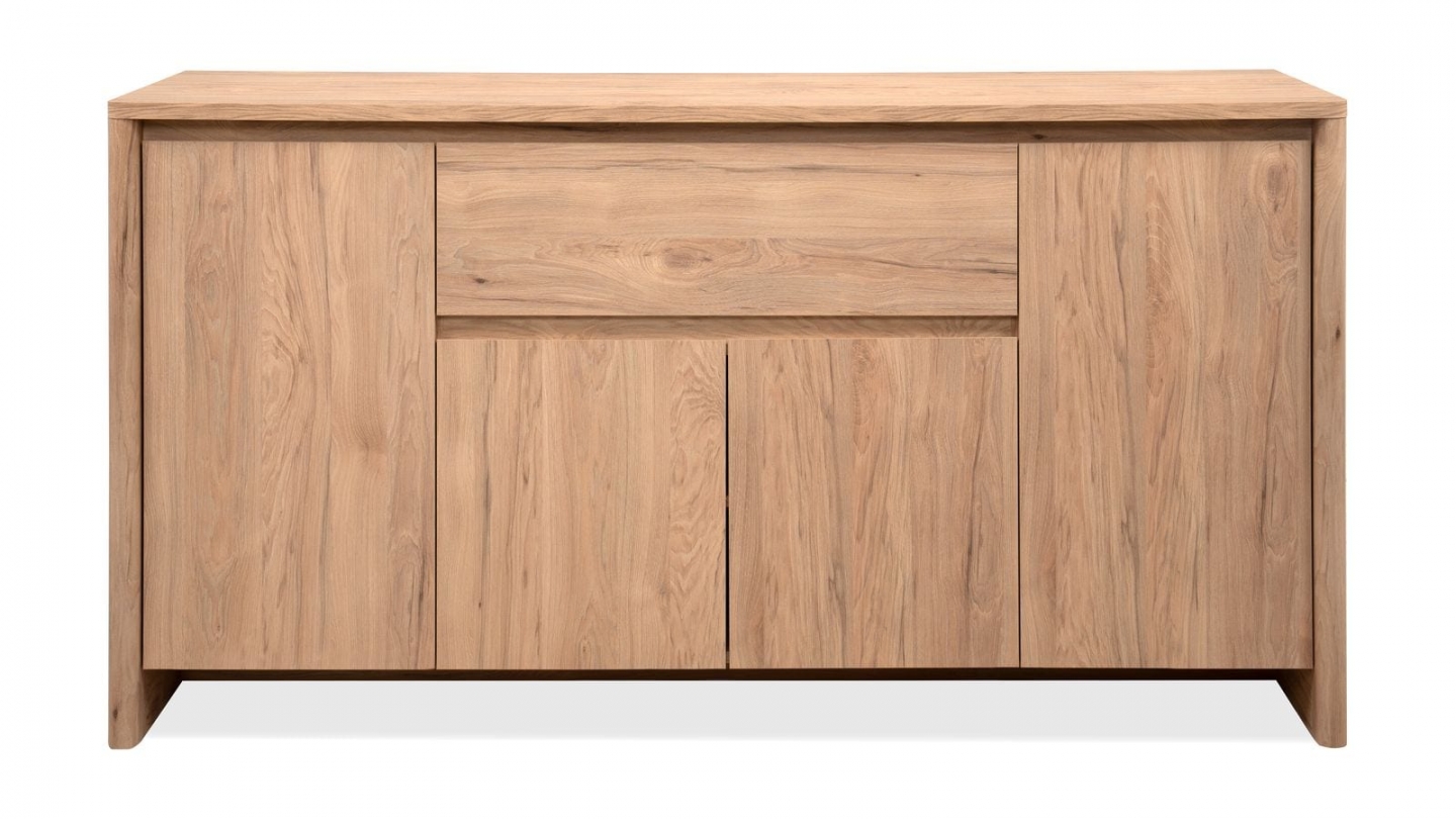 • Buffet effet chêne Sintra• Matière : panneaux de particules, mélaminé• Couleur : naturel effet chêne• Matière du piétement : plastique noir• 5 portes, 7 tablettes et 1 tiroir double• Dimensions totales : 180x42 x90cm• Garantie 2 ans