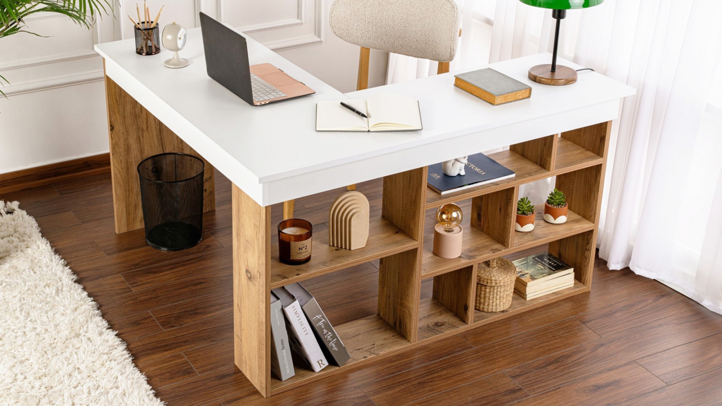 Bureau dangle - Elyra• Matière : Mélamine• Couleur : Plateau blanc - Piètement et rangements effet bois• Bureau d’angle moderne et fonctionnel, alliant design bicolore et nombreux rangements ouverts pour une organisation optimale. Son large plateau en L offre un espace de travail spacieux et ergonomique, tandis que les étagères intégrées accueillent...
