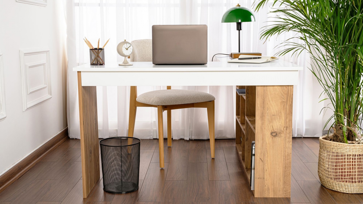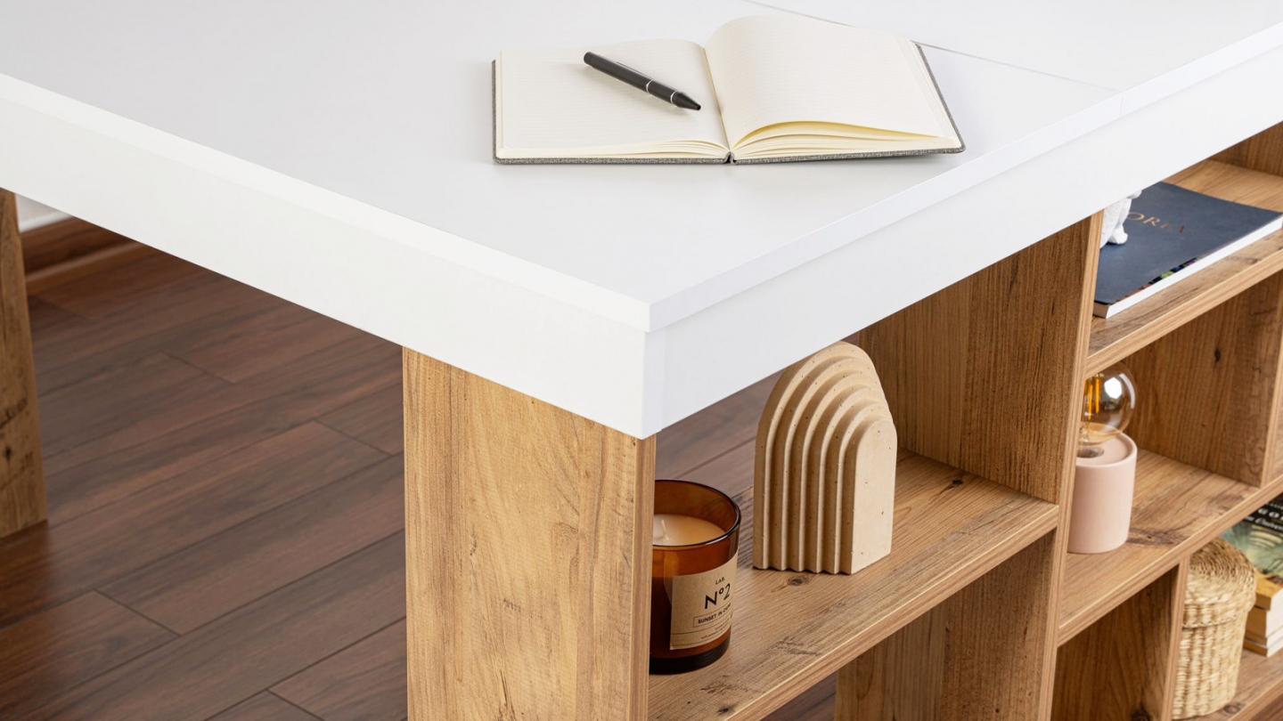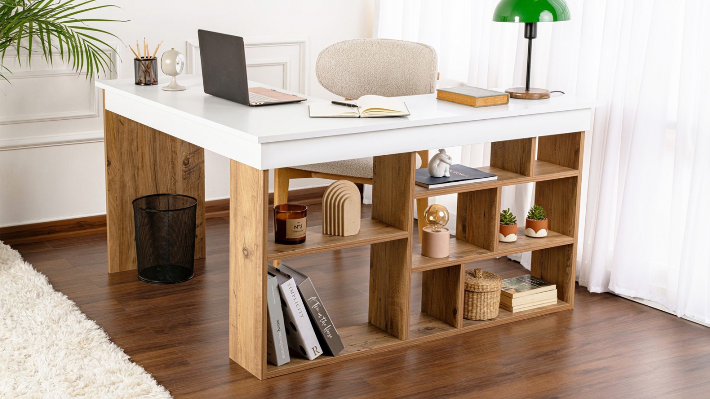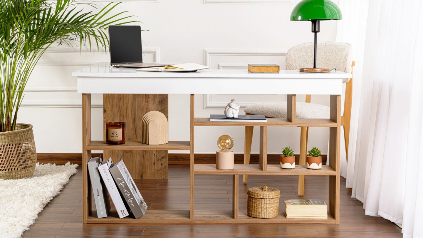 Bureau combiné - Elyra• Matière : Mélamine• Couleur : Blanc et effet bois• Bureau droit au design contemporain, associant finition bois et blanc pour un rendu lumineux et chaleureux. Il dispose de plusieurs rangements intégrés : des étagères ouvertes pour exposer livres ou objets déco, et une niche fermée par une porte pour ranger les accessoires de...