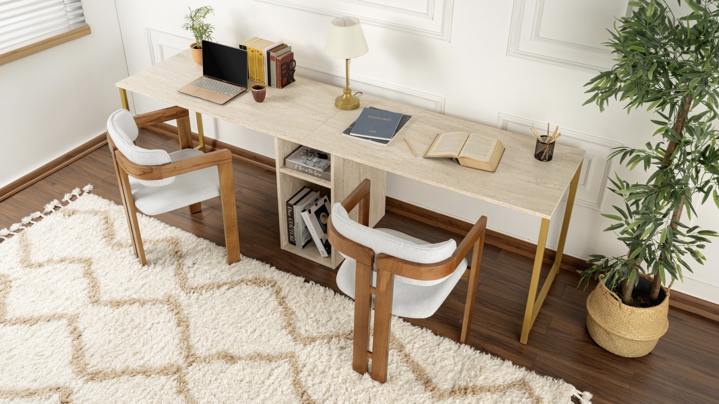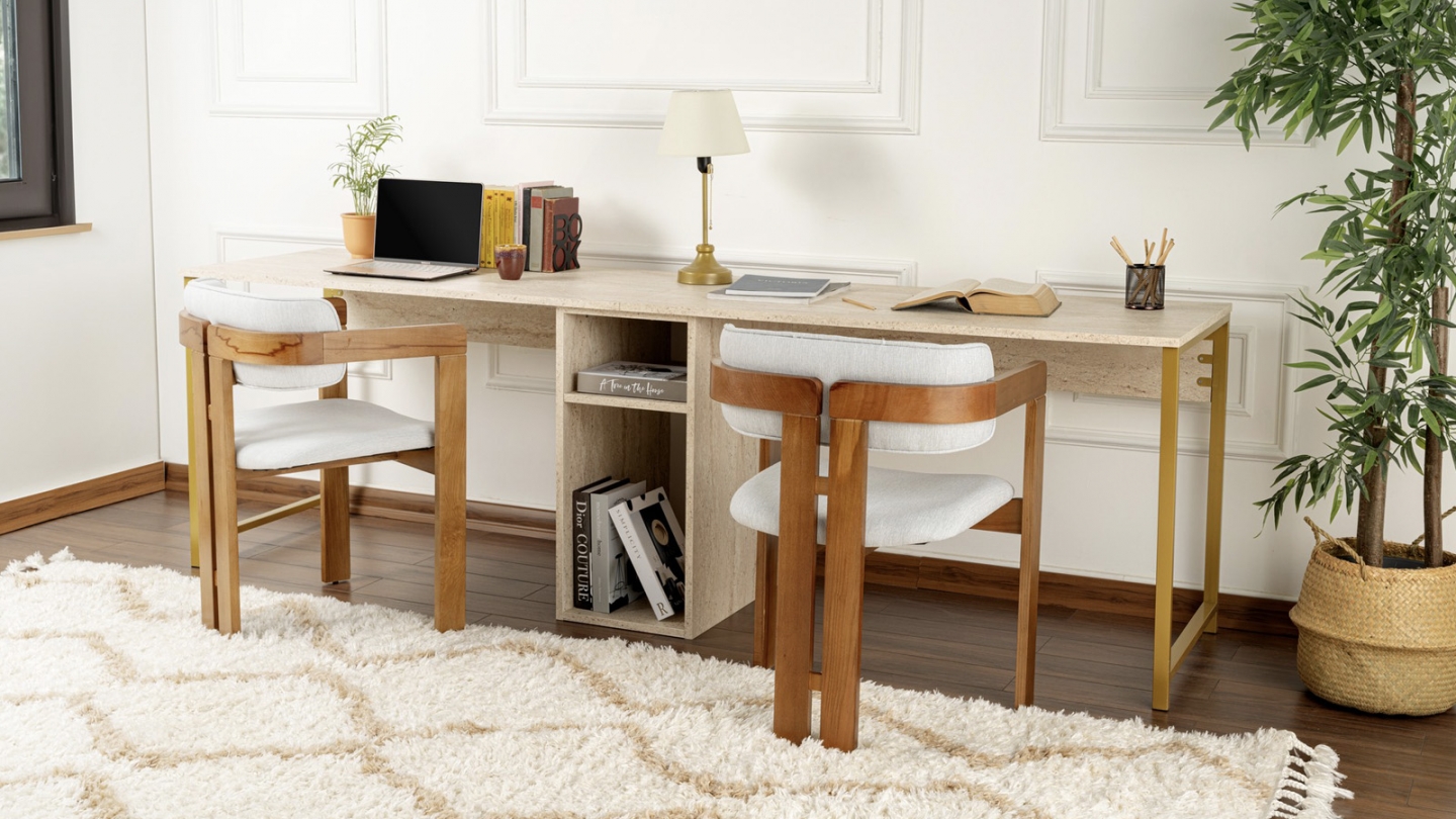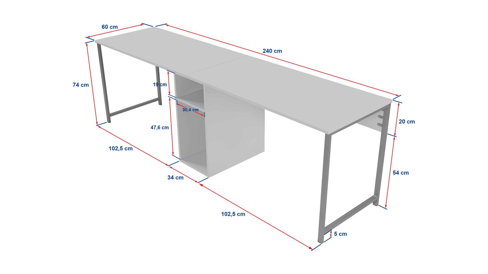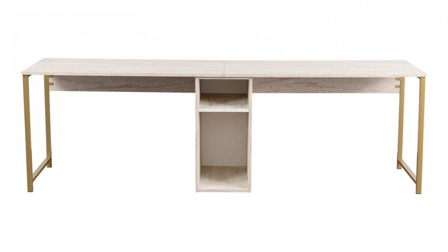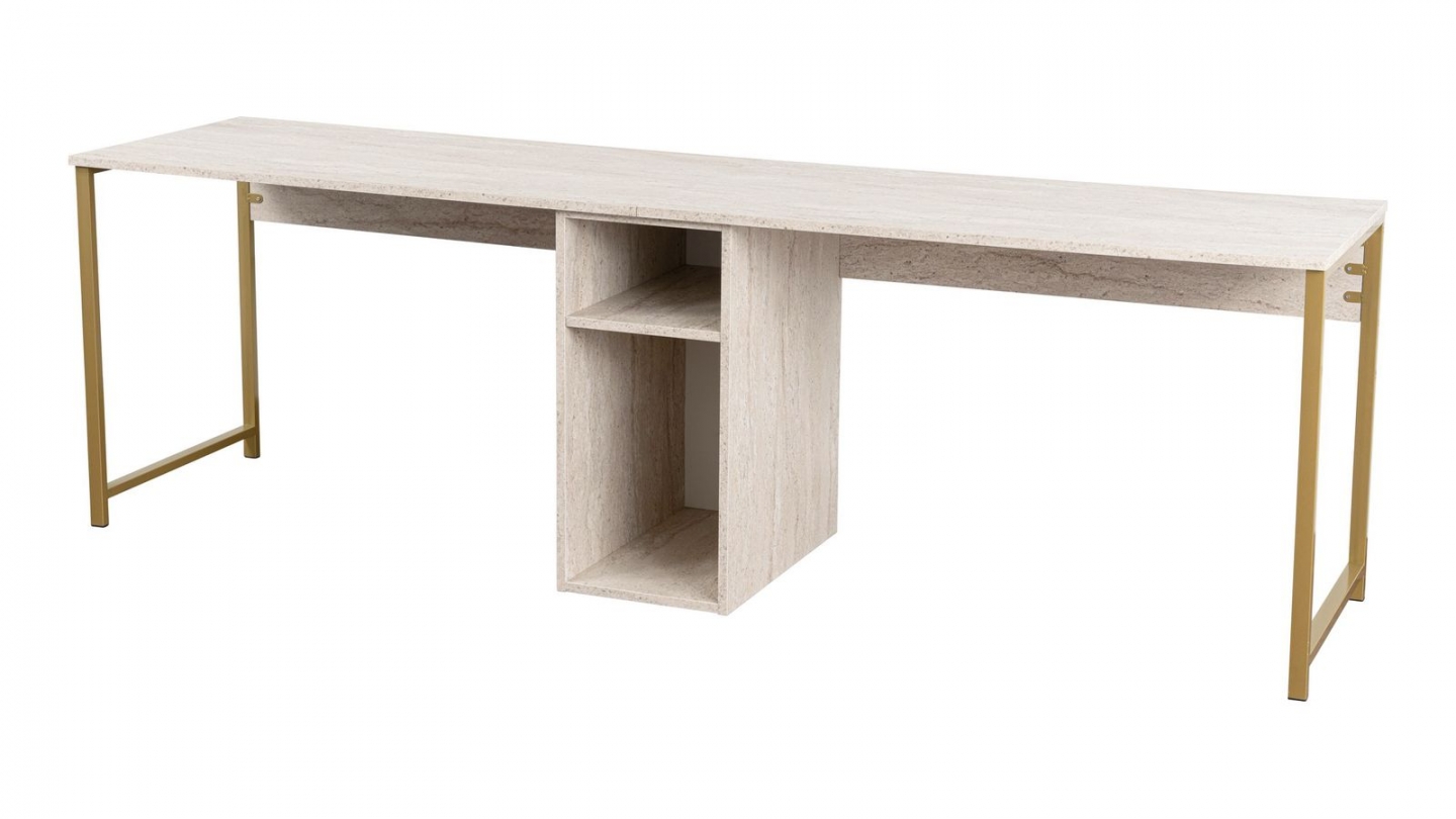 En stockBureau double - Orsa• Matière : Mélamine, métal• Couleur : Blanc - Piètement doré• 2 espaces de travail distincts et un rangement central pratique• Rangements : 2 niches• Dimensions totales : 240 x 60 x 74 cm• Dimensions des niches : Niche inférieure : 30,4x58x47,6 cm - Niche supérieure : 30,4x58x19 cm