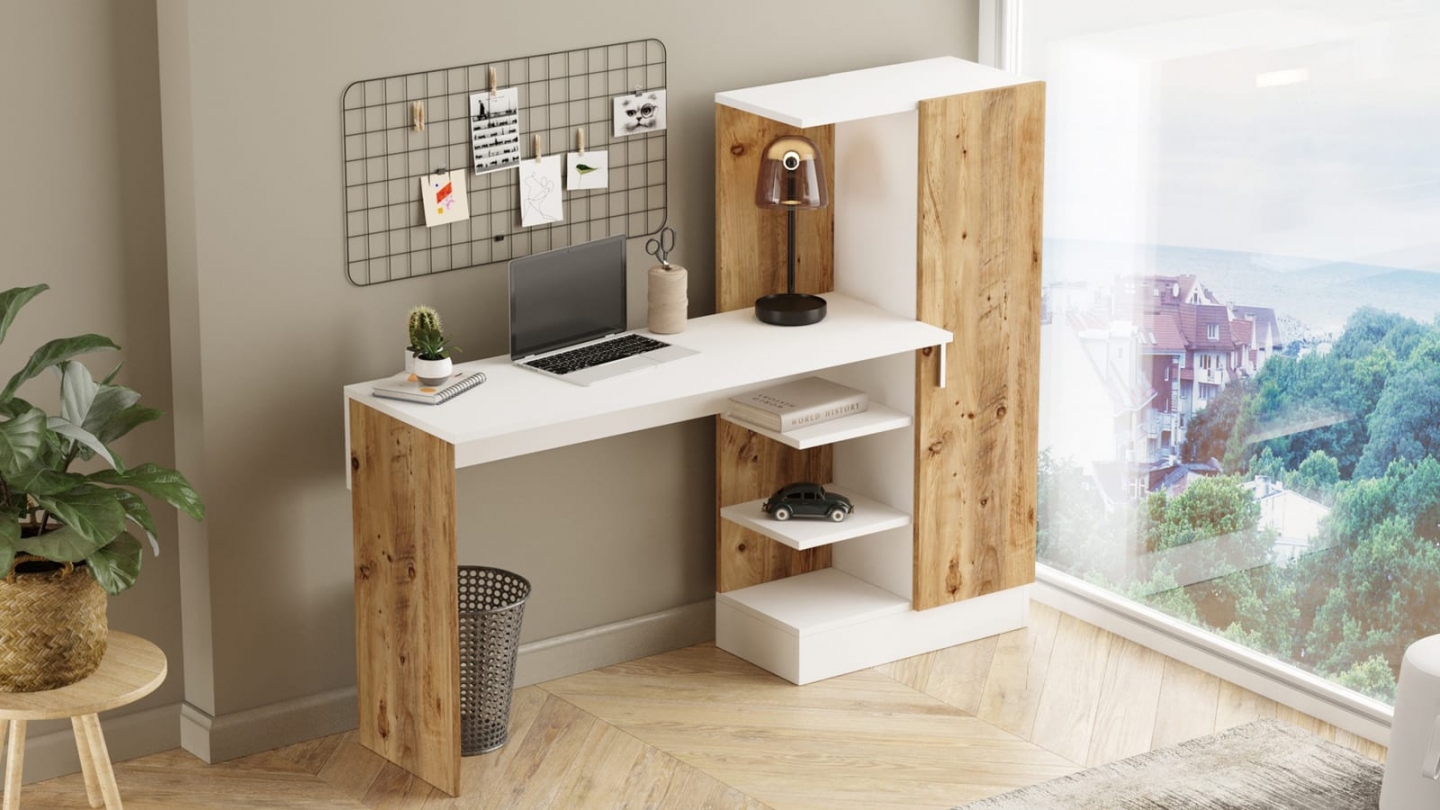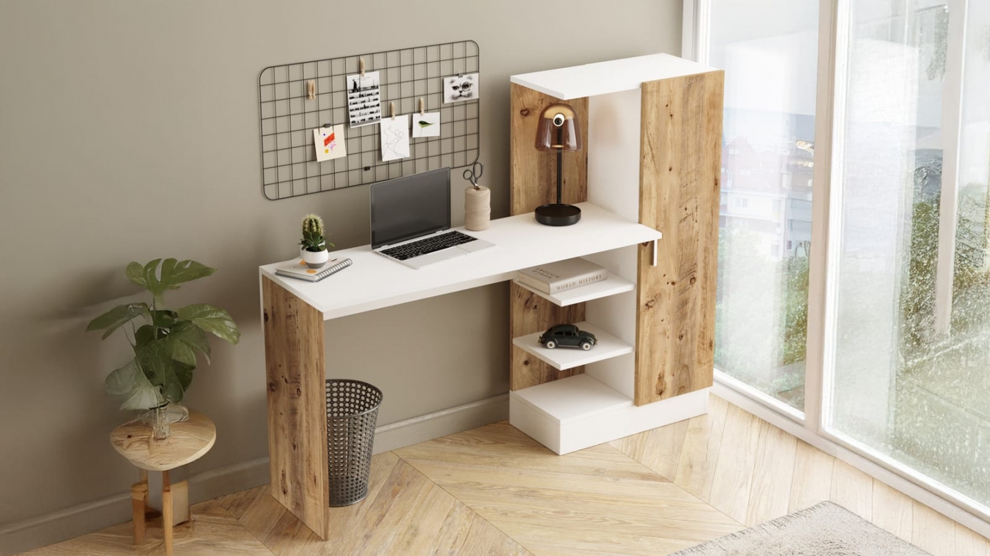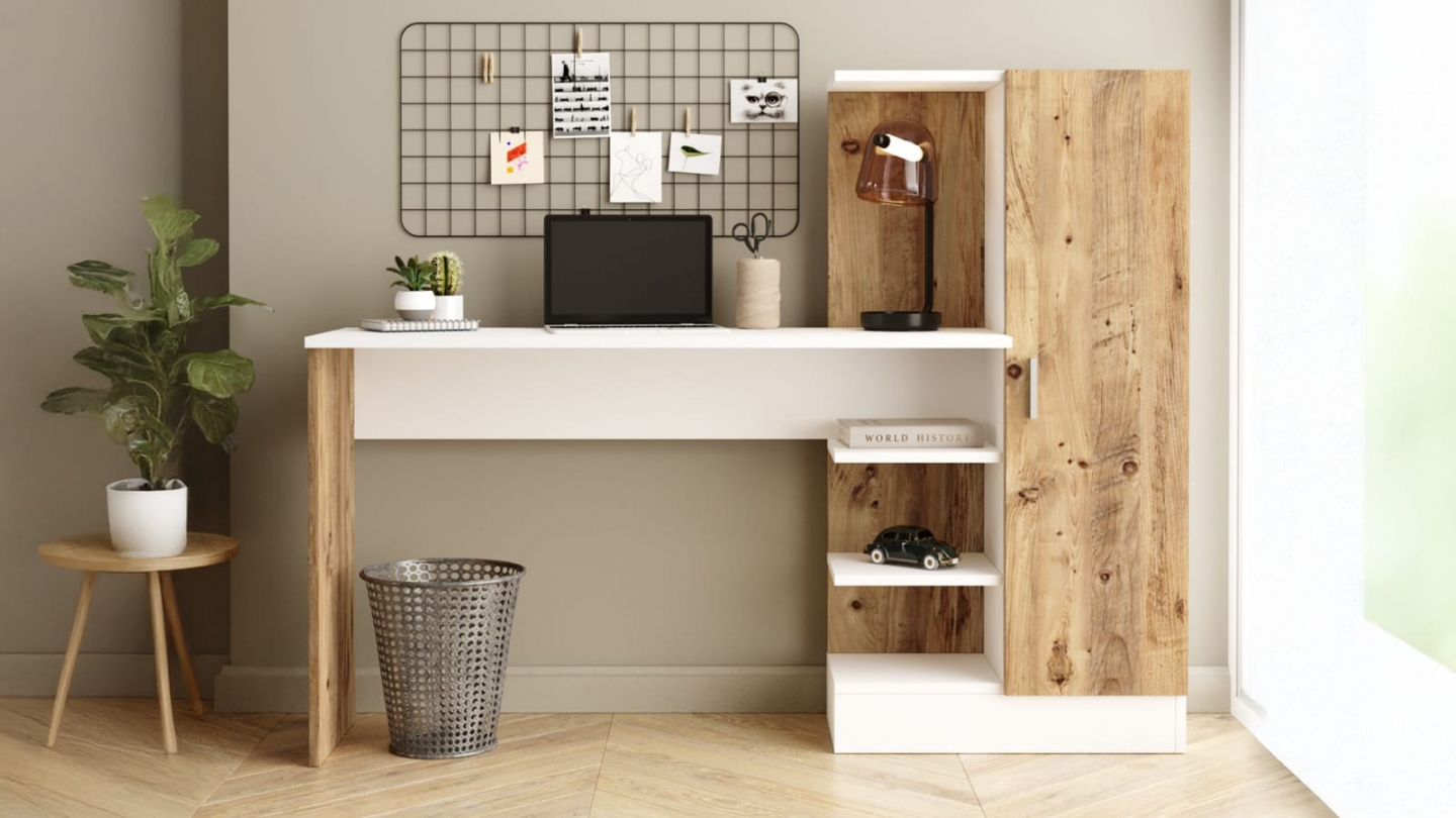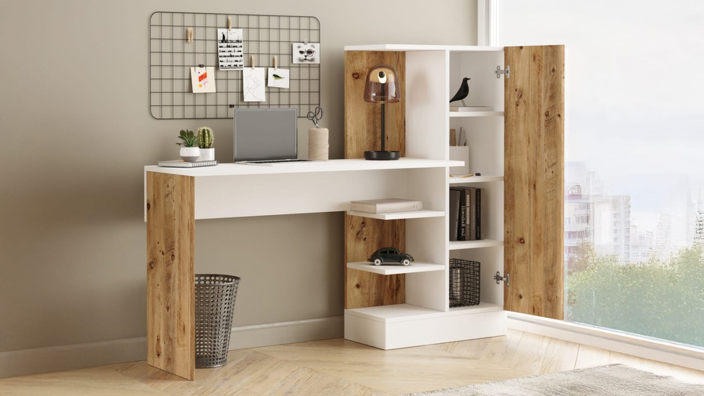 • Bureau droit au design contemporain, associant finition bois et blanc pour un rendu lumineux et chaleureux. Il dispose de plusieurs rangements intégrés : des étagères ouvertes pour exposer livres ou objets déco, et une niche fermée par une porte pour ranger les accessoires de travail à l’abri. Son plateau spacieux et épuré offre un espace de travail confortable, idéal pour le télétravail ou les études.