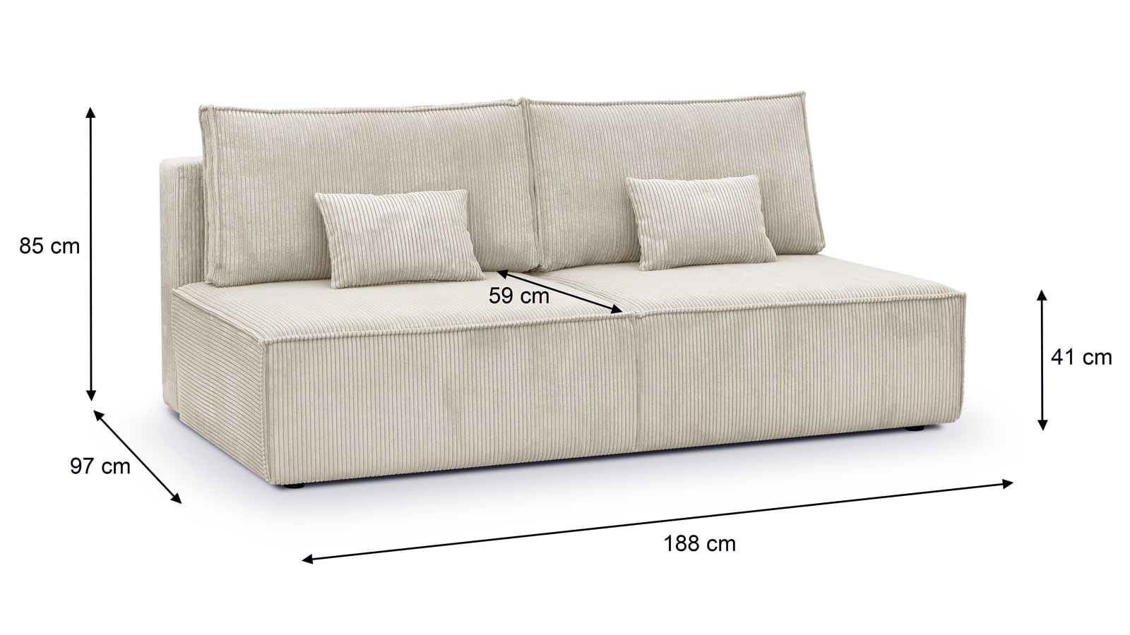 • Largeur de l'assise : 188 cm - Hauteur de l'assise : 85 cm - Profondeur de l'assise : 59 cm