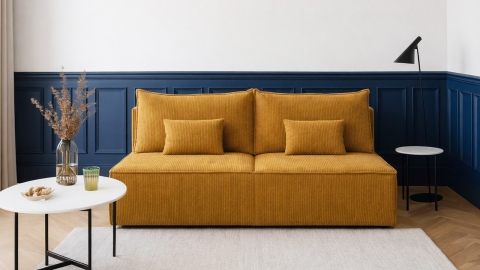 Canapé convertible 3 places avec coffre de rangement en velours côtelé jaune moutarde
