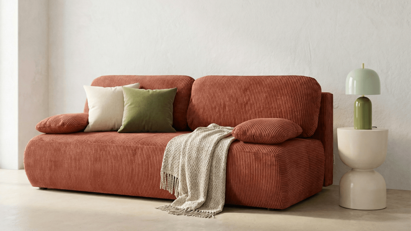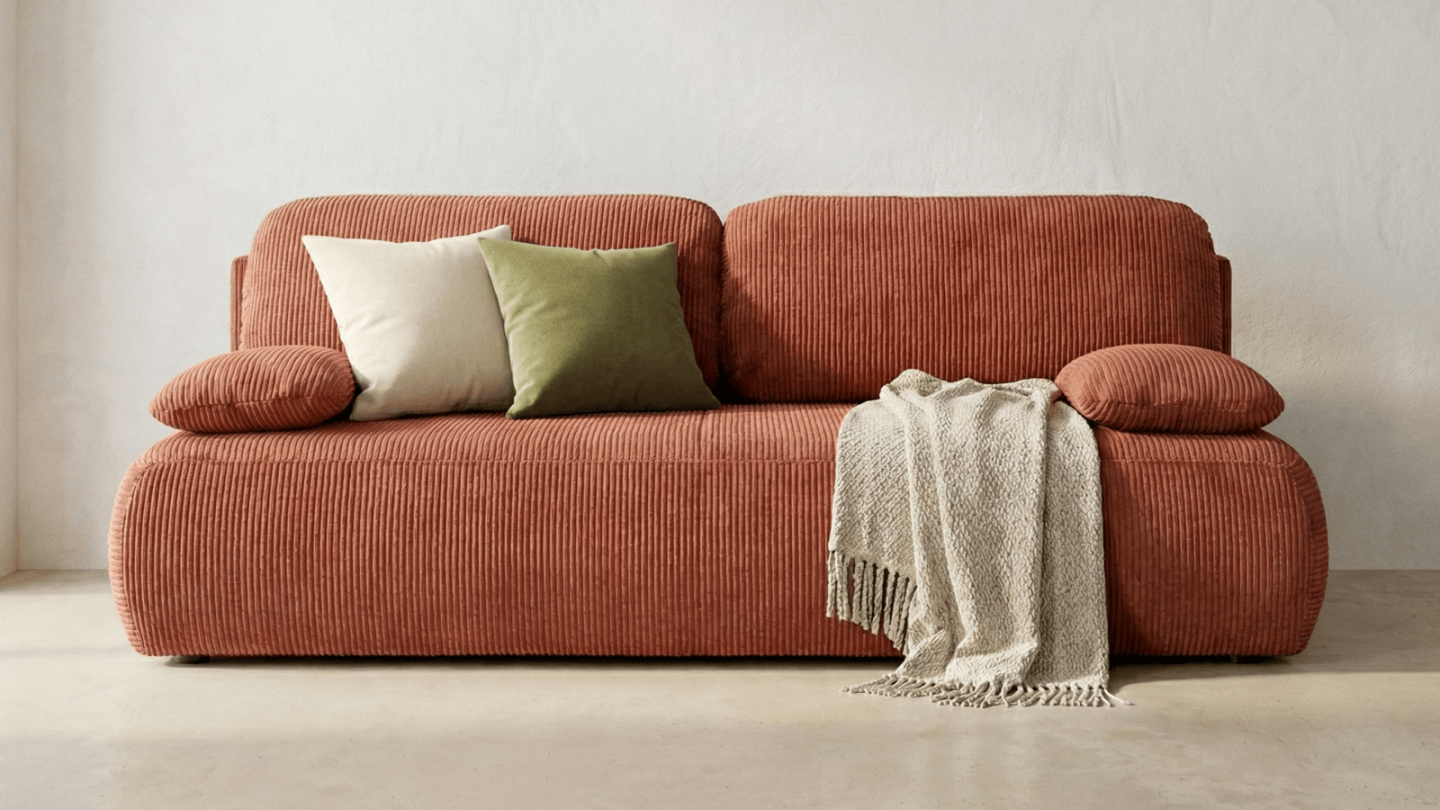 Canapé convertible 3 places en velours côtelé rouille Confort : équilibré : accueil moelleux, soutien ferme Couleur : rouille Revêtement : velours côtelé certifié Oekotex Structure en bois FSC Une assise renforcée avec ressorts métalliques plats pour un meilleur soutien, plus de durabilité et un confort optimal au quotidien Mousse de polyuréthane 30 kg/m3...