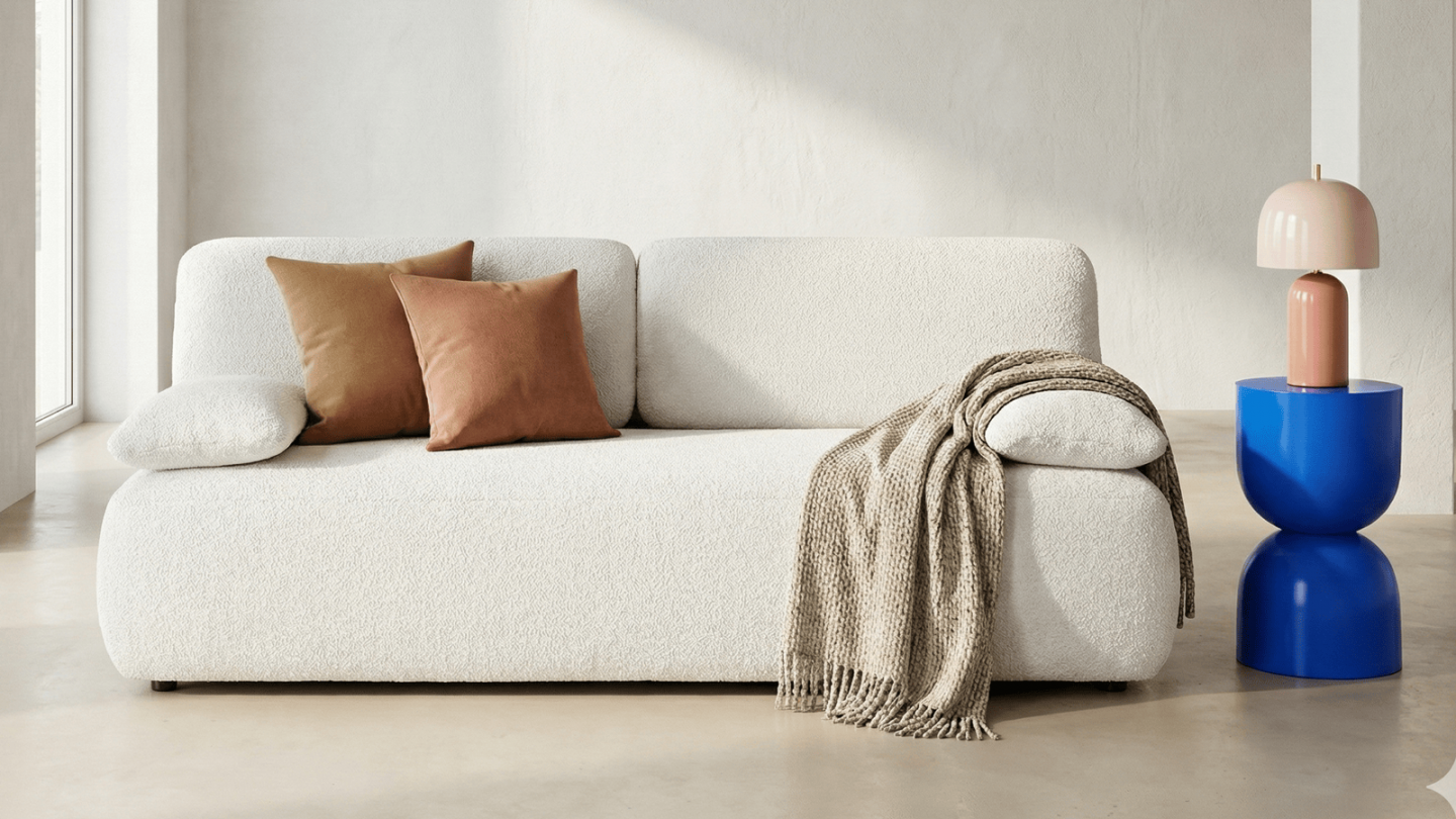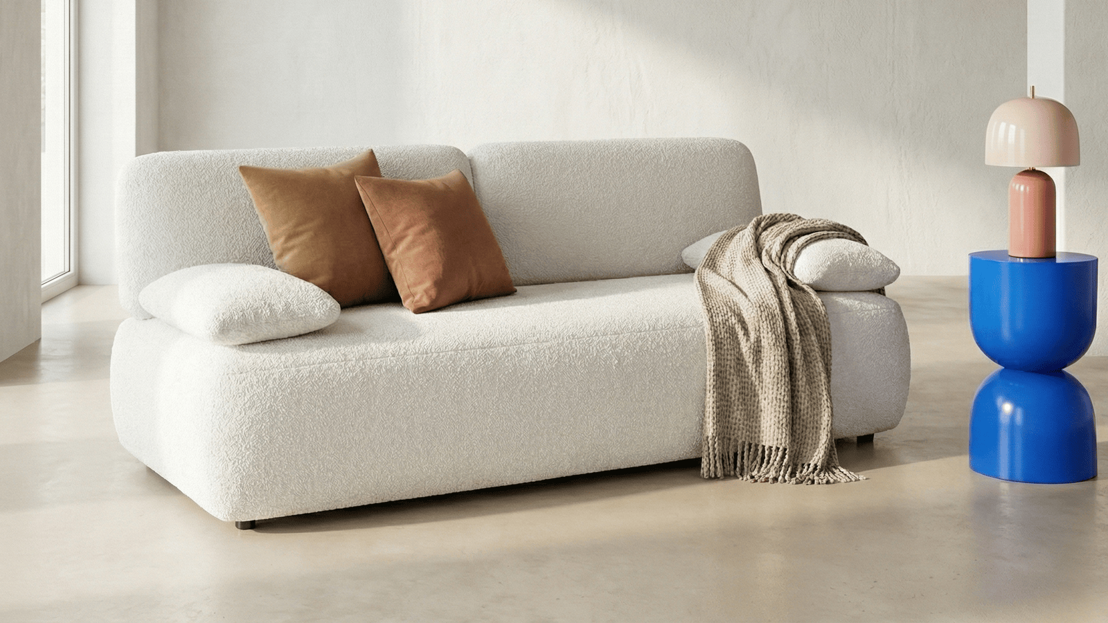 Ce canapé est revêtu d'un tissu bouclé, offrant une atmosphère agréable et cosy. Vous ne pourrez plus vous en passer !
