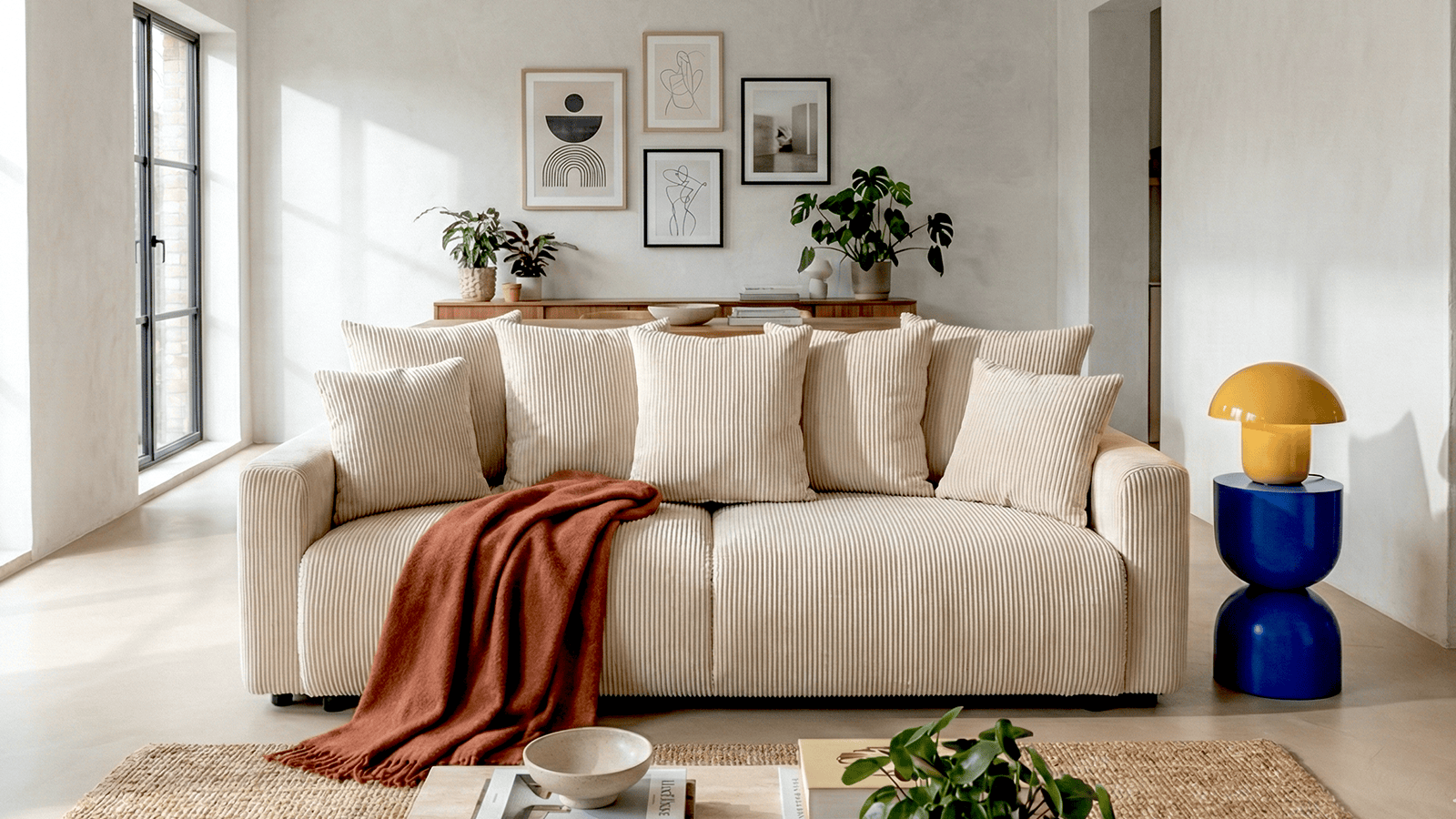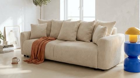 Transformez votre salon avec notre canapé Uma en velours côtelé beige, en un espace de détente et de convivialité où il fait bon se retrouver en famille et entre amis !