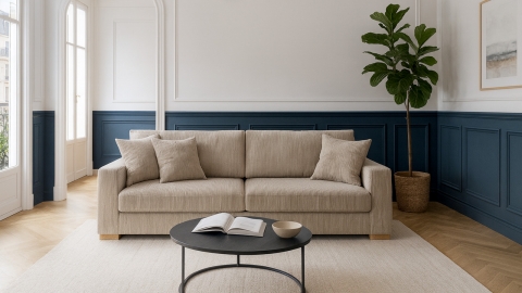 En stockCanapé convertible 3 places en velours côtelé beige Confort : équilibré : accueil moelleux, soutien ferme Couleur : beige Revêtement : velours côtelé certifié Oekotex Structure en bois FSC Une assise renforcée avec ressorts métalliques plats pour un meilleur soutien, plus de durabilité et un confort optimal au quotidien Mousse de polyuréthane 30 kg/m3 :...