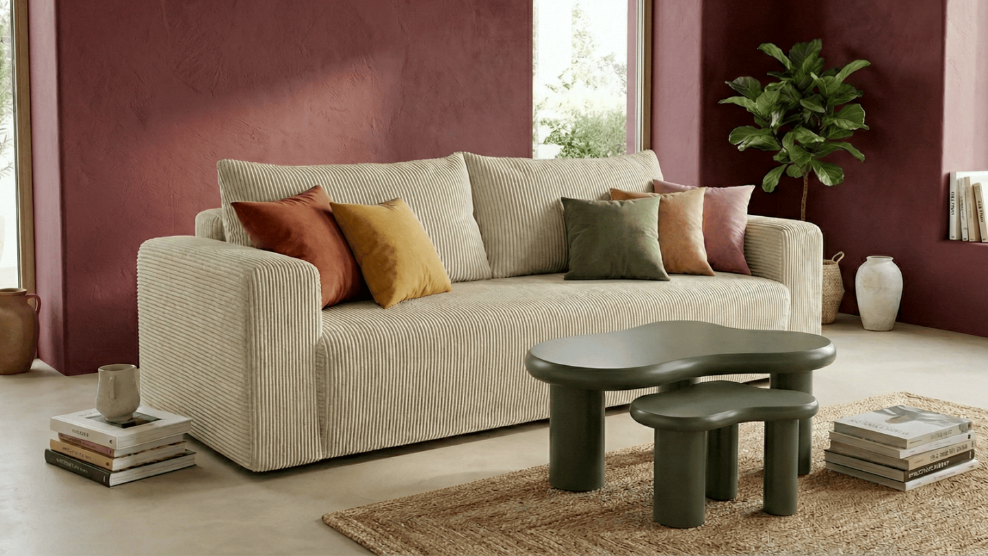 Canapé convertible 3 places en velours côtelé rouille Confort : équilibré : accueil moelleux, soutien ferme Couleur : rouille Revêtement : velours côtelé certifié Oekotex Structure en bois FSC Une assise renforcée avec ressorts métalliques plats pour un meilleur soutien, plus de durabilité et un confort optimal au quotidien Mousse de polyuréthane 30 kg/m3...