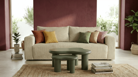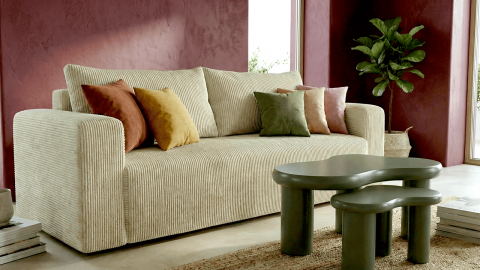 Le canapé convertible Fjord se distingue par son design contemporain et son revêtement en velours côtelé à la texture chaleureuse et élégante. Sa teinte beige, lumineuse et intemporelle, apporte une sensation de douceur et de sérénité à votre intérieur, tout en s’intégrant facilement dans tous les styles de décoration, du minimaliste au plus chaleureux.