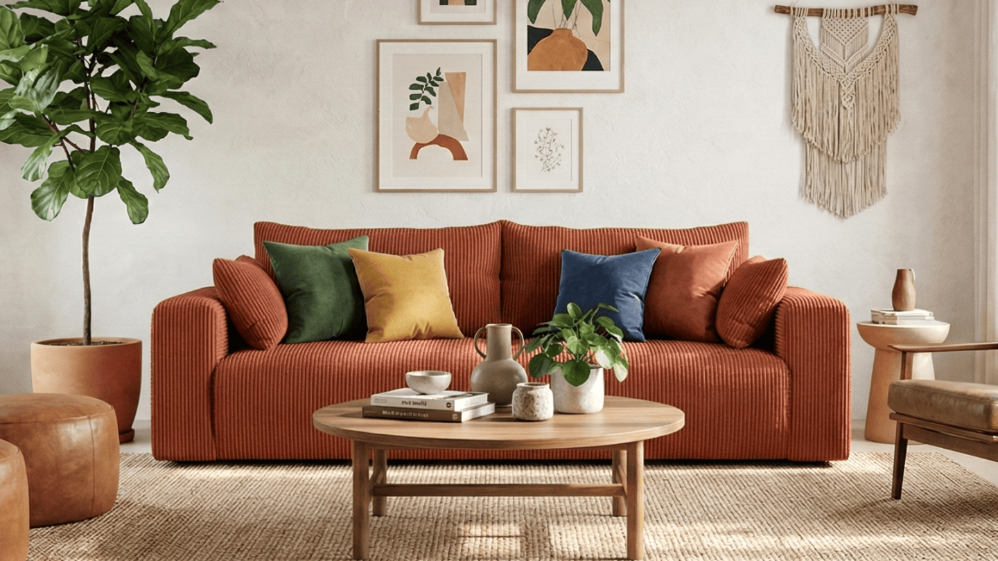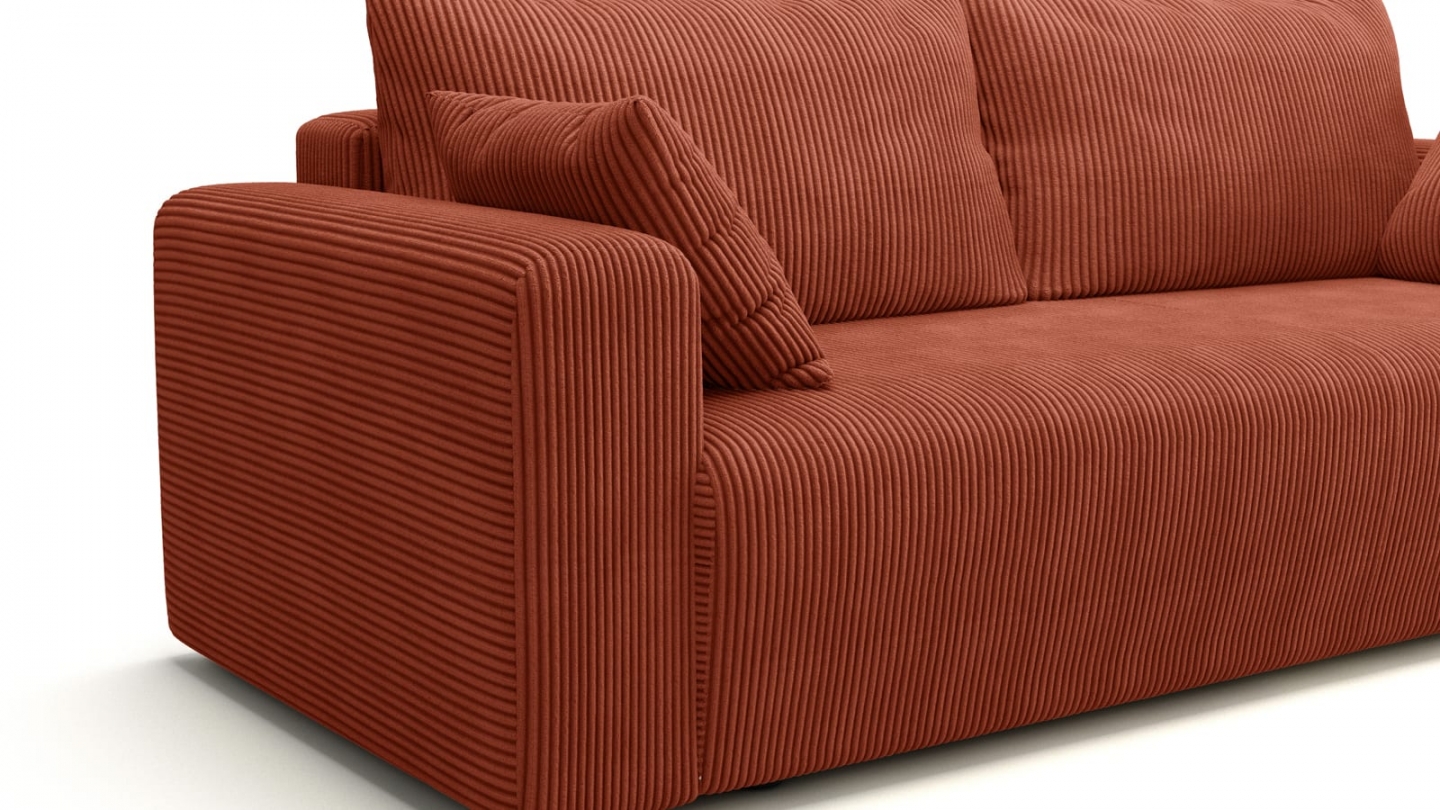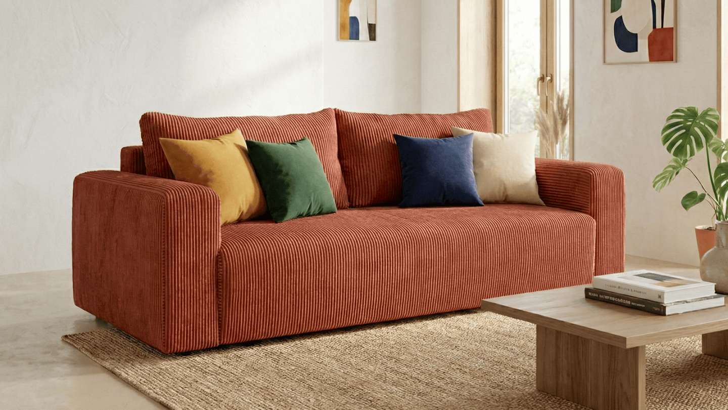 Canapé convertible 3 places en velours côtelé rouille Confort : équilibré : accueil moelleux, soutien ferme Couleur : rouille Revêtement : velours côtelé certifié Oekotex Structure en bois FSC Une assise renforcée avec ressorts métalliques plats pour un meilleur soutien, plus de durabilité et un confort optimal au quotidien Mousse de polyuréthane 30 kg/m3...