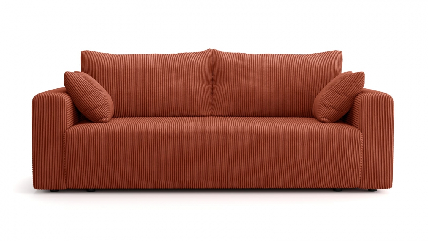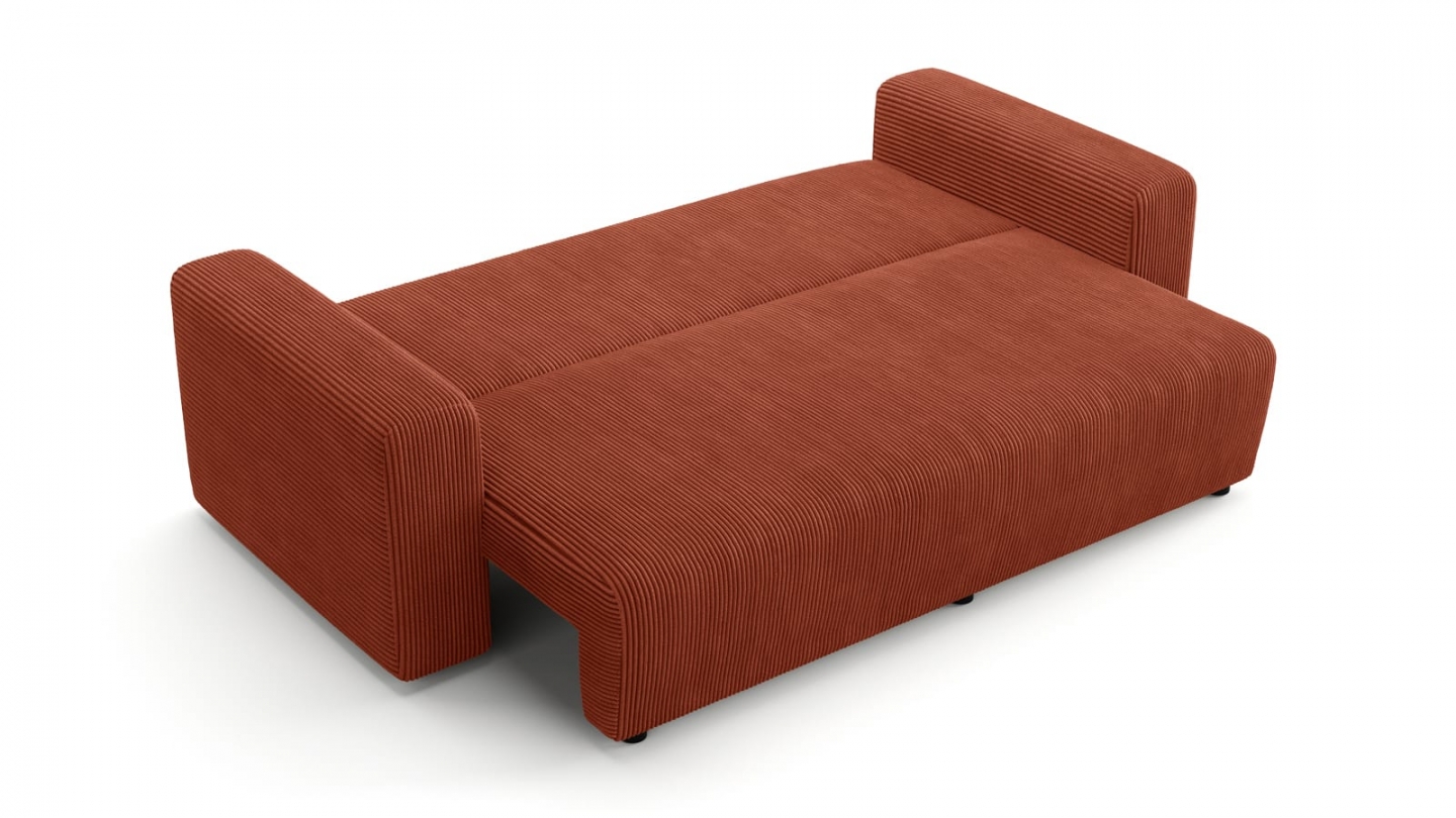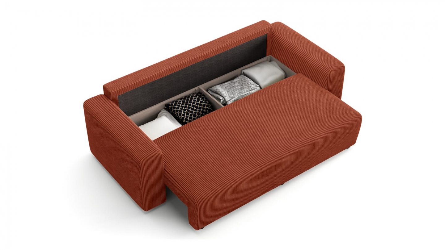 Canapé convertible 3 places en velours côtelé rouille Confort : équilibré : accueil moelleux, soutien ferme Couleur : rouille Revêtement : velours côtelé - certifié Oekotex Coffre de rangement sous l'assise, pratique pour ranger plaid, couettes etc Structure en bois Une assise renforcée avec ressorts métalliques plats pour un meilleur soutien, plus de...