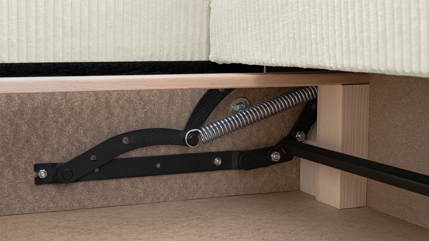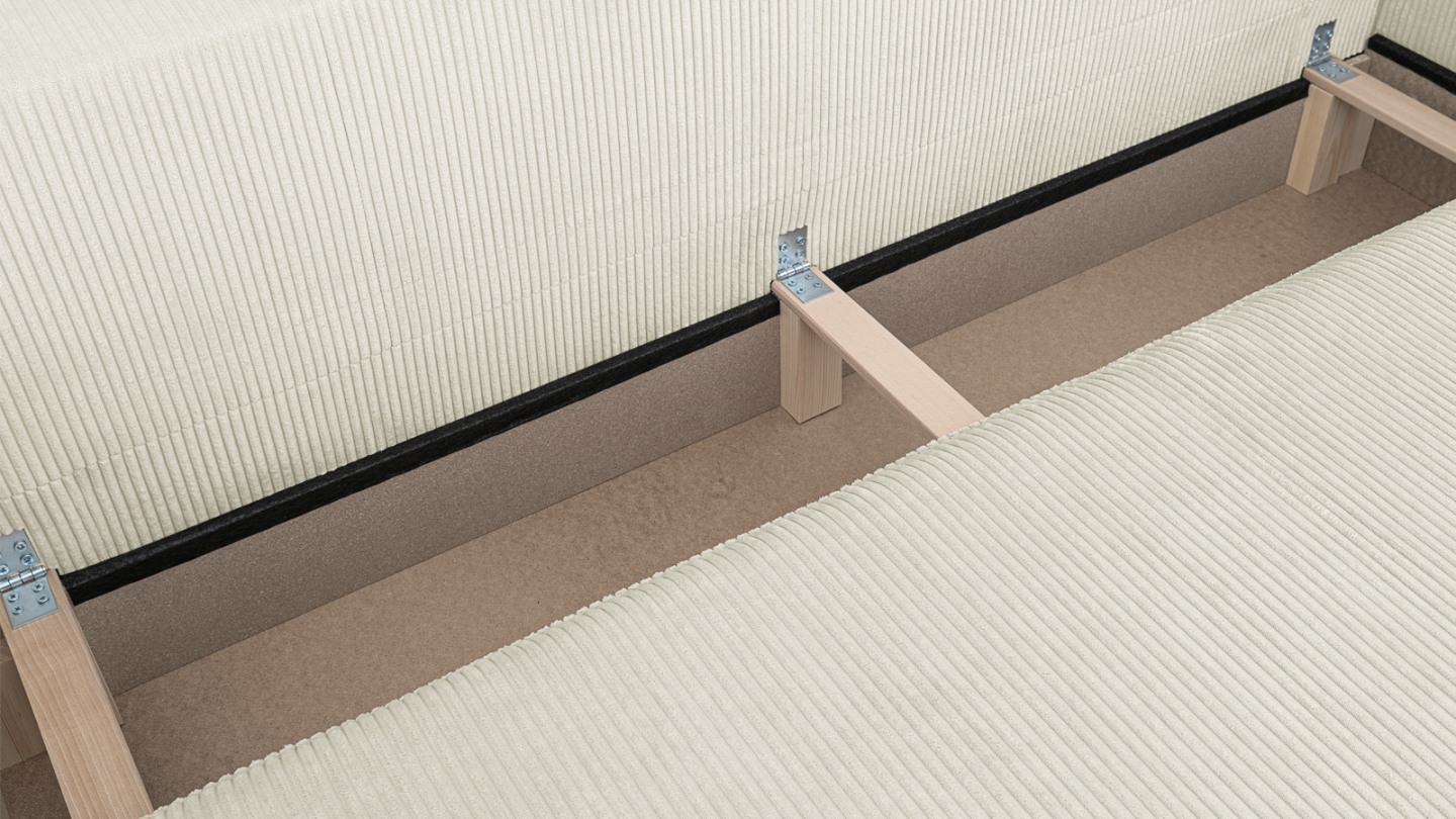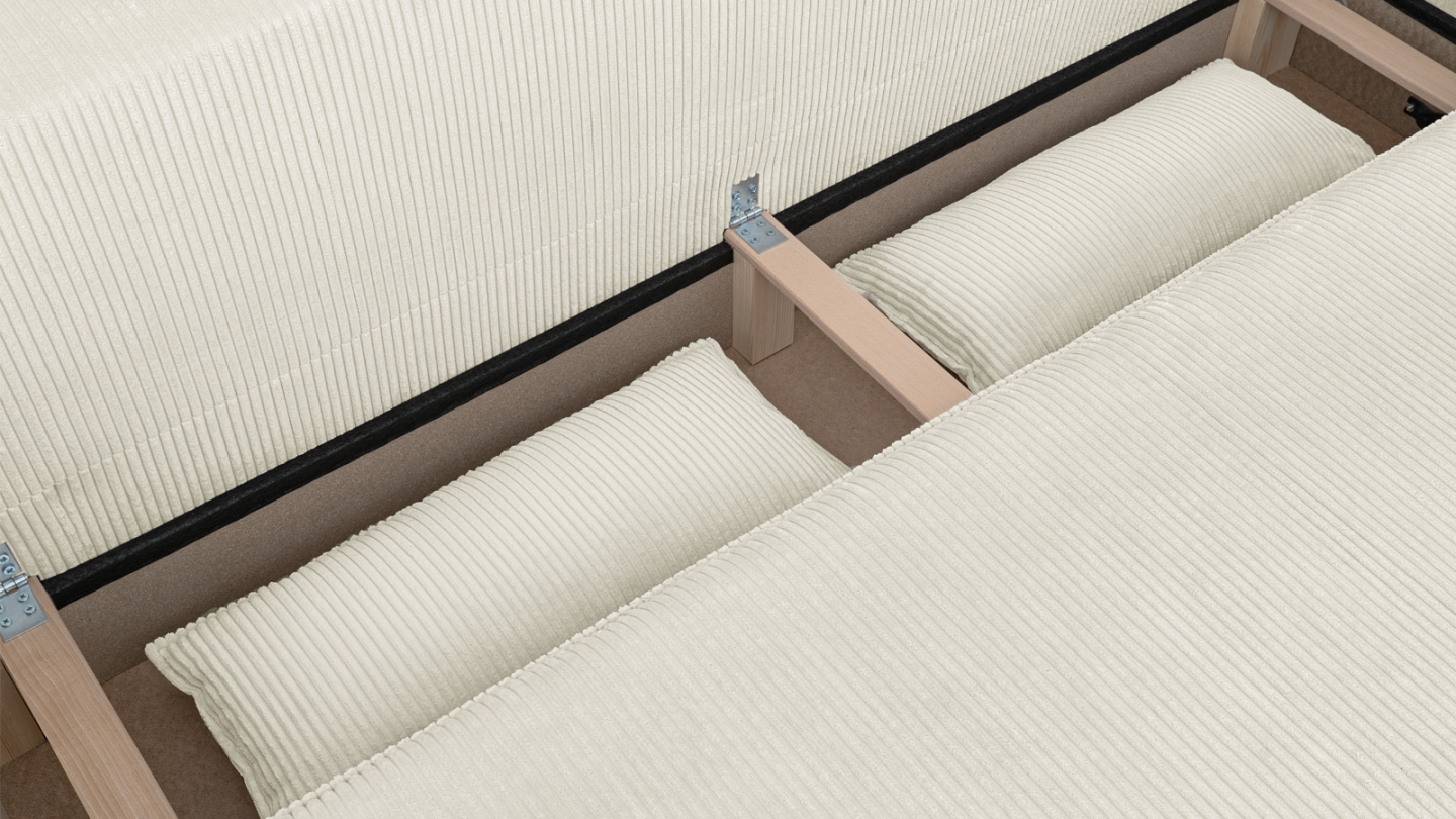 • Coffre de rangement de 186x61x17 cm intégré sous l’assise, pratique pour stocker plaids, coussins ou linge de lit sans encombrer le salon.