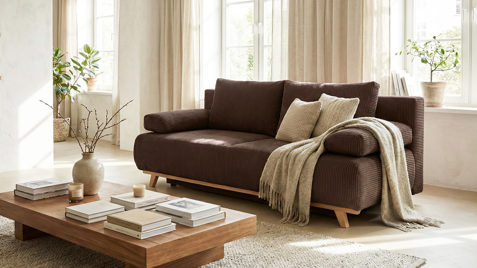 Canapé convertible 3 places en velours côtelé rouille Confort : équilibré : accueil moelleux, soutien ferme Couleur : rouille Revêtement : velours côtelé certifié Oekotex Structure en bois FSC Une assise renforcée avec ressorts métalliques plats pour un meilleur soutien, plus de durabilité et un confort optimal au quotidien Mousse de polyuréthane 30 kg/m3...