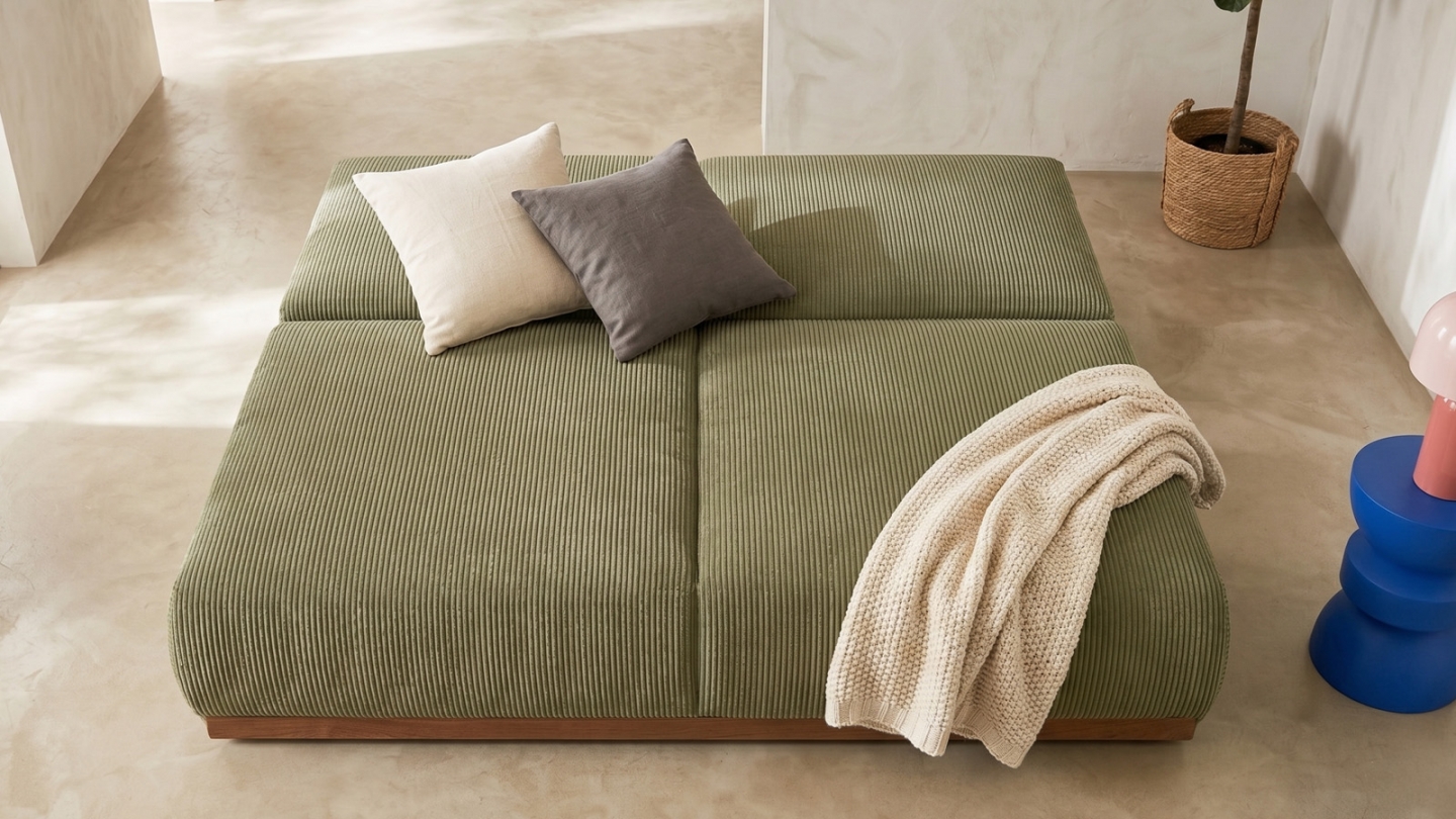 Canapé convertible Auteuil — velours côtelé beige Le canapé convertible Auteuil séduit par sa silhouette épurée et ses matières nobles. Sans accoudoirs, il affiche un design contemporain et généreux, souligné par un piètement en bois massif coloris Noyer. Convertible en un instant Le mécanisme automatique déploie le couchage en quelques secondes, sans...